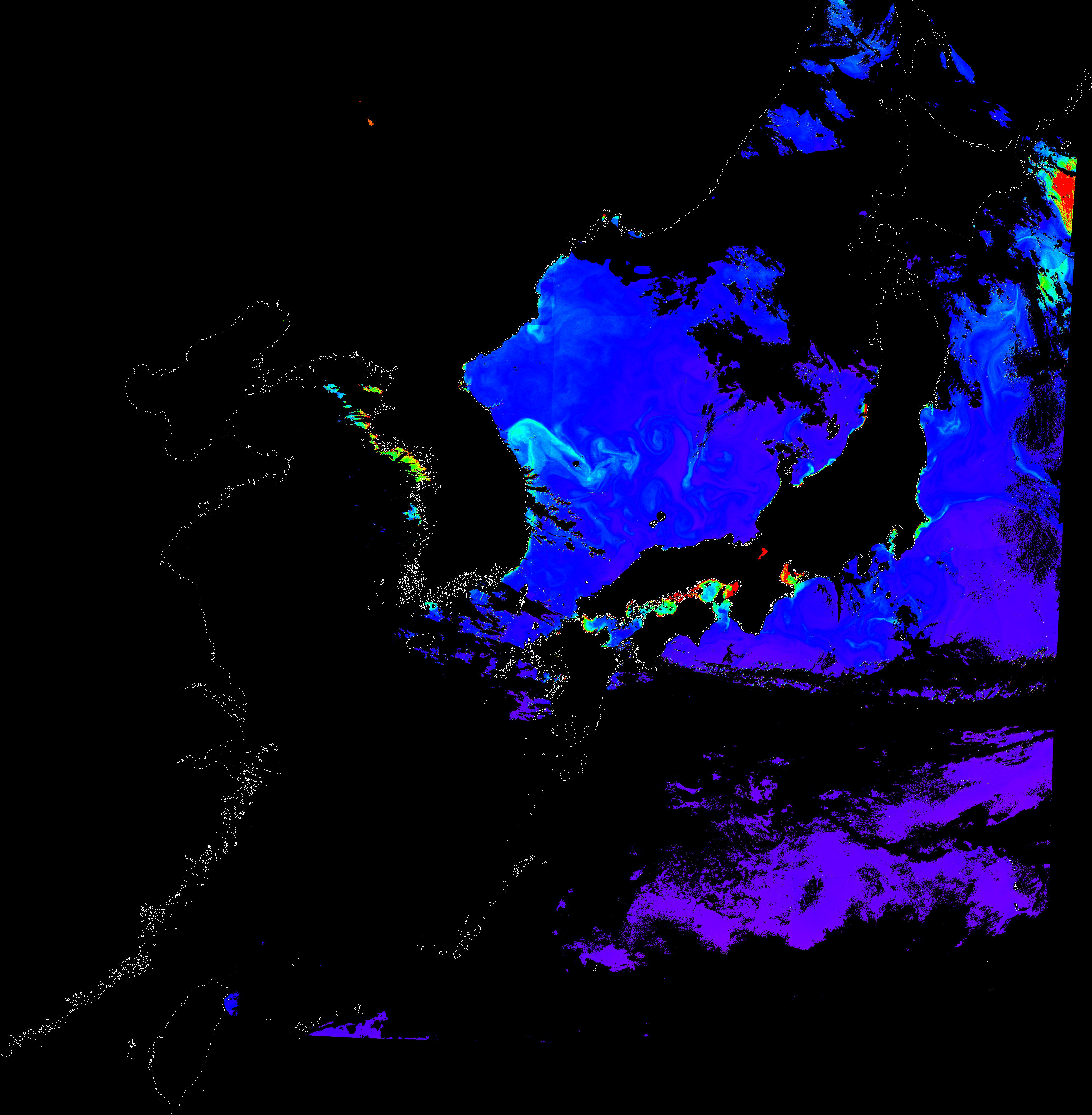 o 2016년 6월 3일 천리안 GOCI 클로로필 a 위성영상입니다.