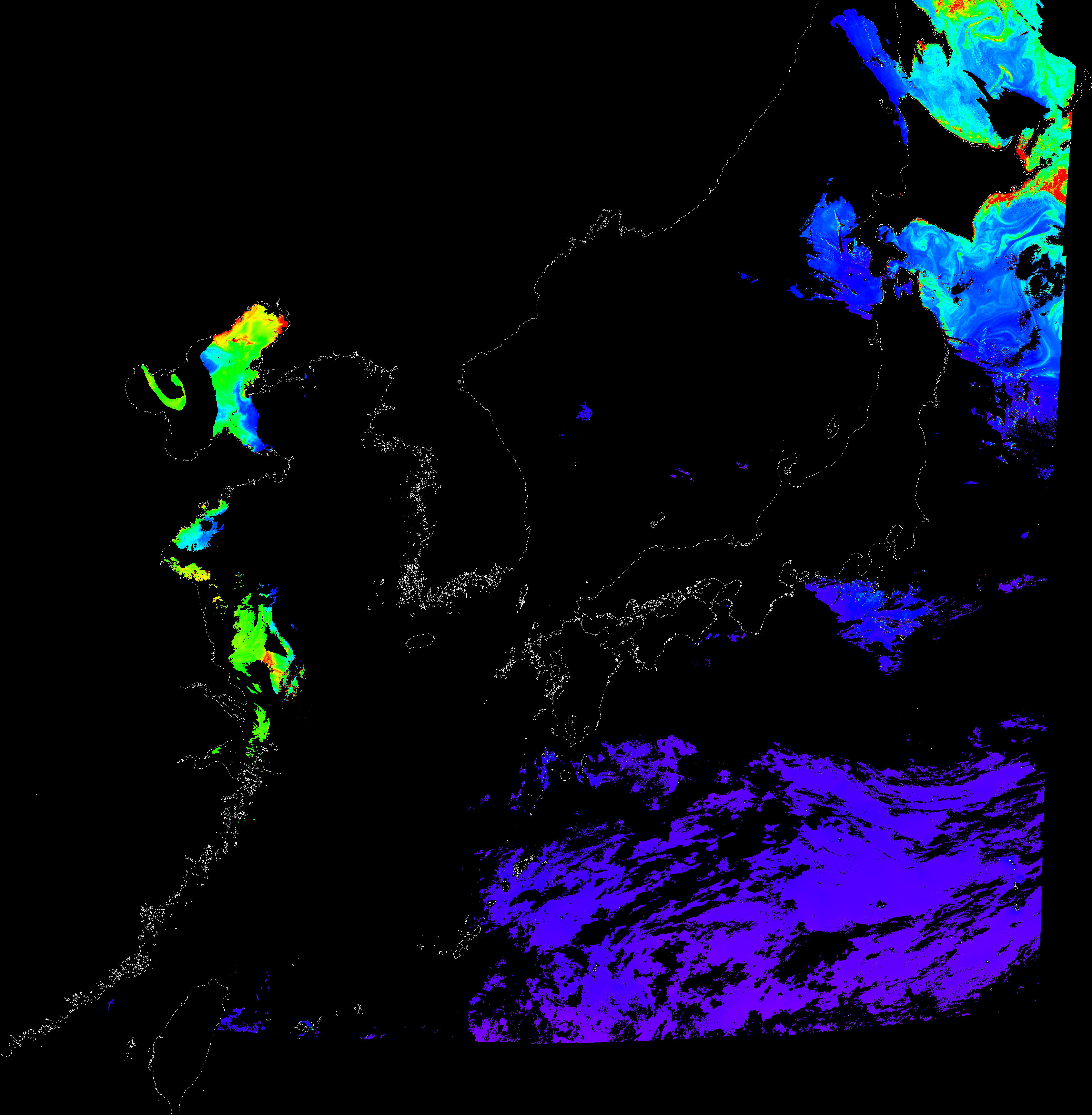 o 2016년 6월 6일 천리안 GOCI 클로로필 a 위성영상입니다.