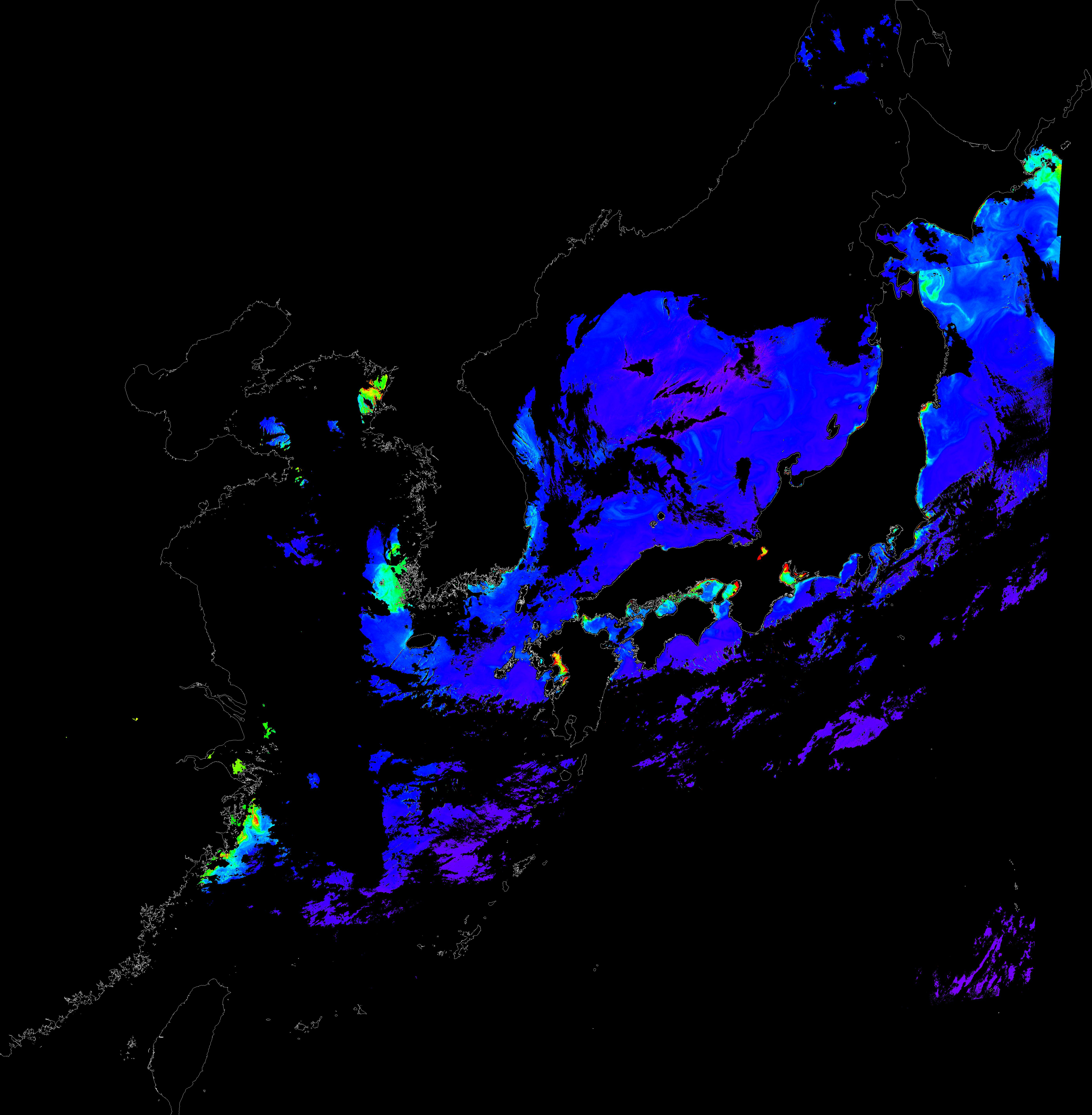 o 2016년 6월 10일 천리안 GOCI 클로로필 a 위성영상입니다.