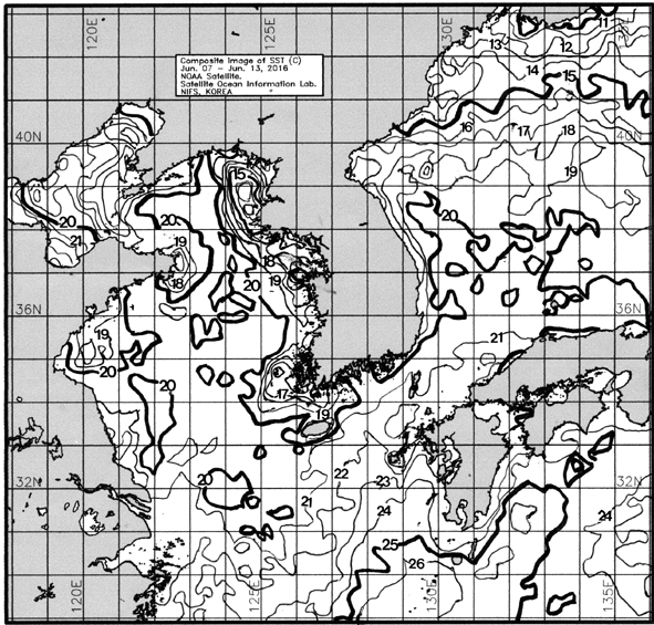 ◦ 금주(2016. 06. 07 ~ 06. 13)의 한국근해 표면수온은 대화퇴 근해 18~19도, 울릉도-독도 근해 20~21도, 대마도 근해 20~22도, 제주도 근해 19~20도, 이어도 근해 20~21도, 가거초 근해 18~19도, 어청도 근해 18~20도, 백령도 근해 14∼16도로 나타납니다. ◦ 「평년에 비해」대화퇴 근해 2도 높게, 울릉도-독도 근해 2도 높게, 대마도 근해 1도 높게, 제주도 근해 비슷하게, 이어도 근해 1도 높게, 가거초 근해 0.5도 높게, 어청도 근해 1.5도 높게 나타납니다. ◦ 「전년에 비해」대화퇴 근해 2도 높게, 울릉도-독도 근해 1도 높게, 대마도 근해 1도 높게, 제주도 근해 0.5도 높게, 이어도 근해 비슷하게, 가거초 근해 1도 낮게, 어청도 근해 1.5도 높게, 백령도 근해 0.5도 낮게 나타납니다. ◦ 수온 전선대는 우리나라 제주해협에서 대한해협까지 20도를 중심으로 형성됩니다. =$row['content']?> =$row['content']?> =$row['content']?> |