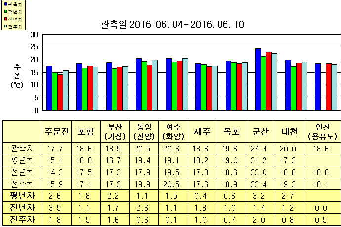 ◦ 금주(2016. 06. 04 ~ 06. 10)의 한반도 연안 표면수온은 동해 연안역에서 섭씨 17.5~19.0도, 남해 연안역 18.5~21.0도, 서해 연안역에서 18.5~24.5도로 나타납니다. ◦ 평년에 비해 동해 연안역은 1.5~3.0도 높게, 제주 비슷함을 제외한 남해 연안역은 0.5~1.5도 높게, 서해 연안역은 0.5~3.5도 높게 나타납니다. ◦ 전년에 비해 동해 연안역은 1.0~3.5도 높게, 남해 연안역은 1~3도 높게, 인천 비슷함을 제외한 서해 연안역은 1.0~1.5도 높게 나타납니다. =$row['content']?> =$row['content']?> =$row['content']?> |
