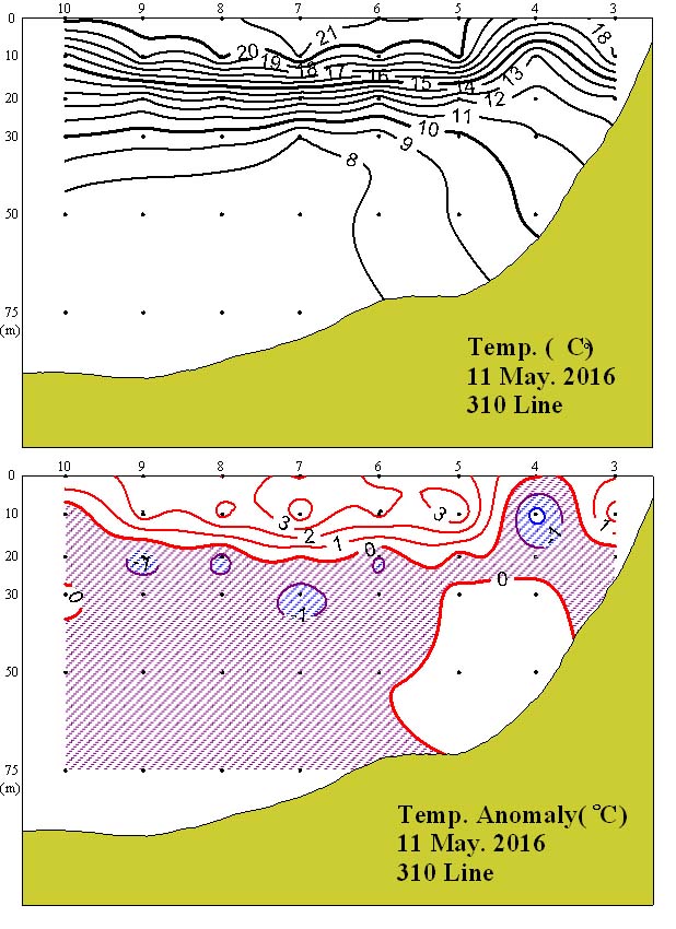 ◦ 2016년 6월 11일 국립수산과학원 서해수산연구소에서 조사한 310선(영광 서방)의 수직수온분포도 및 평년편차도입니다. ◦ 조사해역 내에서 수심 10~50m 사이에서 15℃를 중심으로 수온약층이 형성되었고, 7~21℃의 수온분포를 보였습니다.