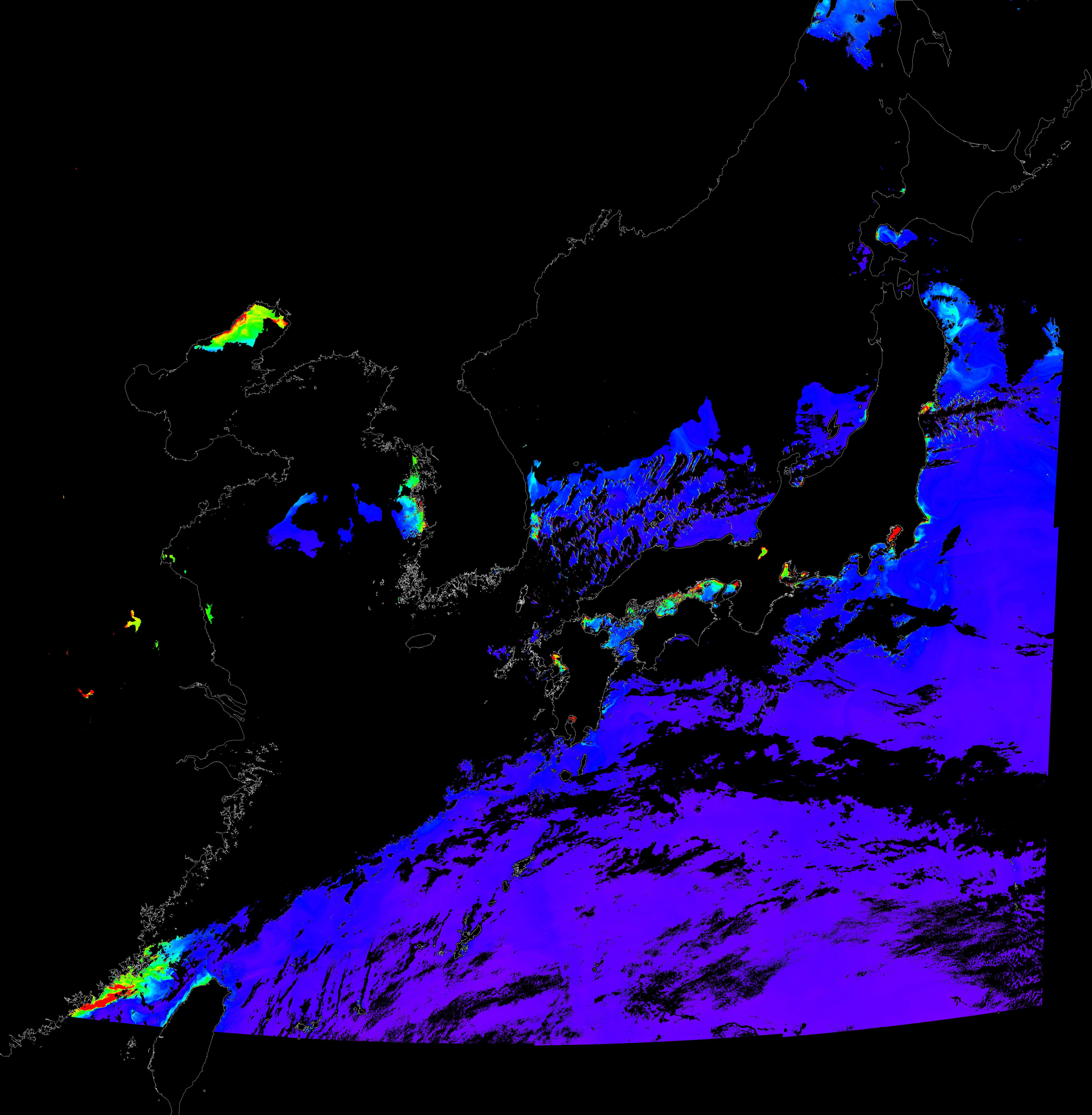 o 2016년 6월 18일 천리안 GOCI 클로로필 a 위성영상입니다.