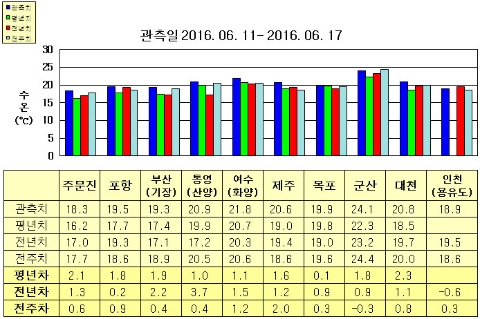 ◦ 금주(2016. 06. 11 ~ 06. 17)의 한반도 연안 표면수온은 동해 연안역에서 섭씨 18.0~19.5도, 남해 연안역 20.5~22.0도, 서해 연안역에서 18.5~24.5도로 나타납니다. ◦ 평년에 비해 동해 연안역은 1.5~2.5도 높게, 남해 연안역은 1~2도 높게, 목포 비슷함을 제외한 서해 연안역은 1.5~2.5도 높게 나타납니다.