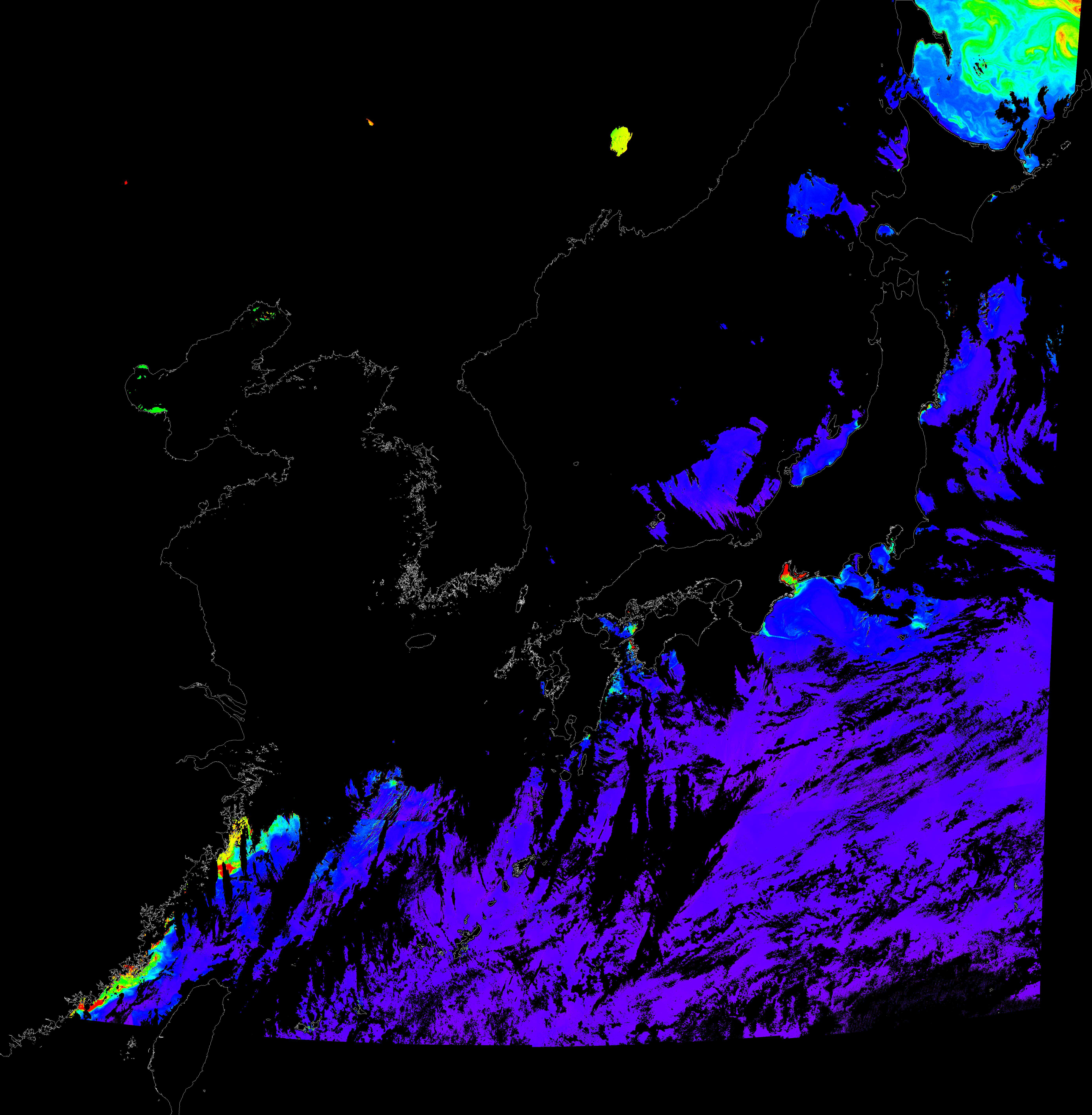 o 2016년 7월 1일 천리안 GOCI 클로로필 a 위성영상입니다.