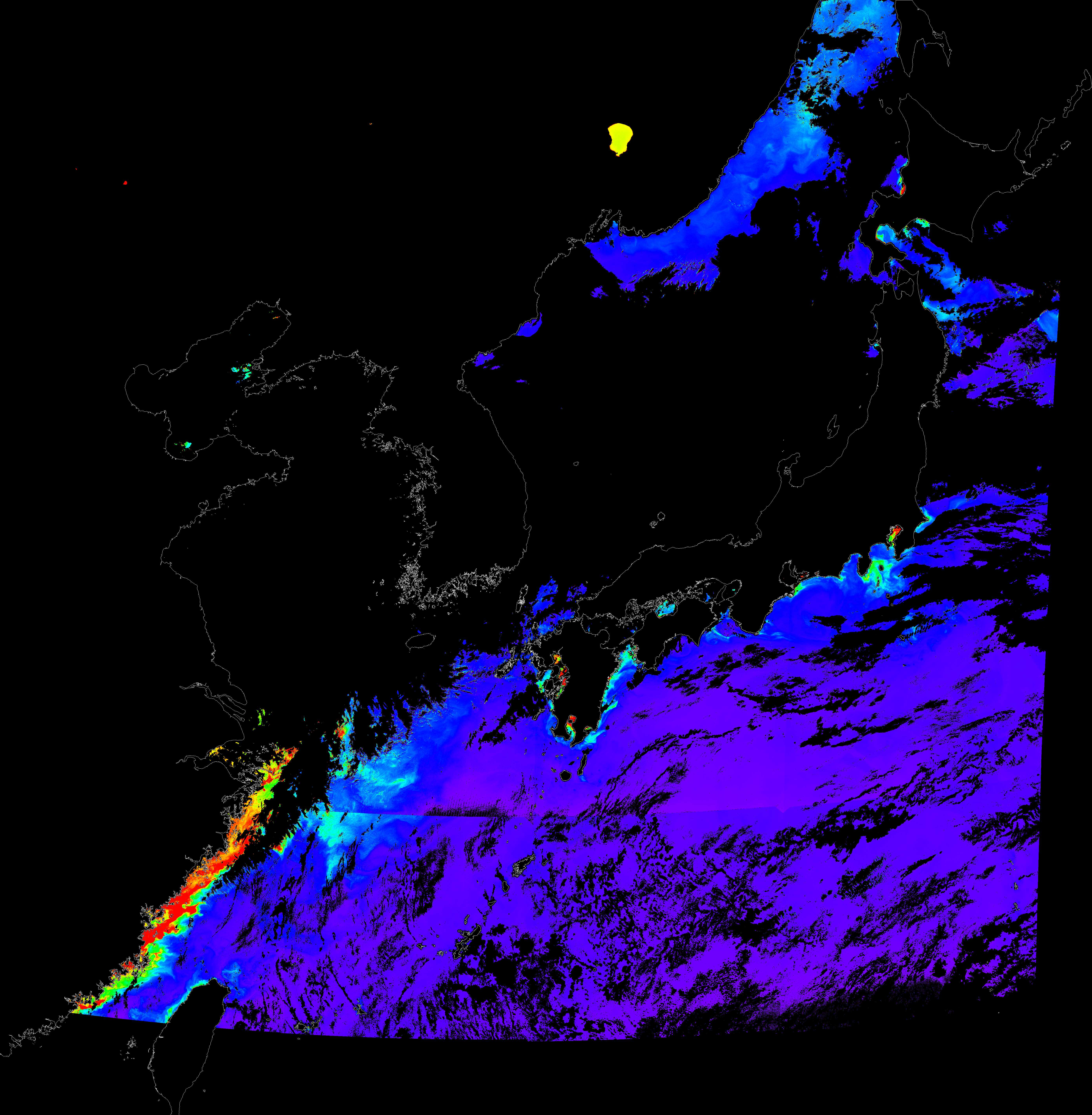 o 2016년 7월 4일 천리안 GOCI 클로로필 a 위성영상입니다.