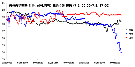 ◦ 2016년 7월 8일, 17시를 기하여 삼척 주변 연안에 냉수대 주의보를 발령합니다. ◦ 아래 그림은 국립수산과학원의 실시간 해양환경 어장정보시스템의 표층수온 분석 결과, 동해 연안의 강릉, 삼척 및 영덕에서의 최근 수온 변동 경향은 아래와 같습니다. (2016년 7월 5일, 00:00∼ 2016년 7월 8일, 17:00) ◦ 7월 8일 17시 00분 현재, 삼척은 13.9℃로 전일에 비하여 4.5℃ 내외, 7월 5일 대비 5.5℃ 내외 수온이 하강하였습니다. 주변의 강릉과 영덕은 뚜렷한 수온의 하강이 나타나고 있지 않습니다. ◦ 향후, 삼척 주변의 강원 및 경북 연안에서도 수온 하강이 나타날 가능성이 있으며, 태풍/열대성 저기압의 통과로 인하여 수온의 변동이 심화될 수 있습니다. 지속적으로 국립수산과학원의 실시간 해양환경 어장정보시스템의 실시간 수온 정보(www.nifs.go.kr/risa/subpage/index.jsp)를 주의 깊게 관찰하여 주시기 바랍니다. ◦ 냉수대가 발생하는 경우, 수온이 급격하게 변화해 양식생물의 폐사와 짙은 해무에 의한 선박 안전사고가 우려되오니 각별한 관심이 필요합니다. |