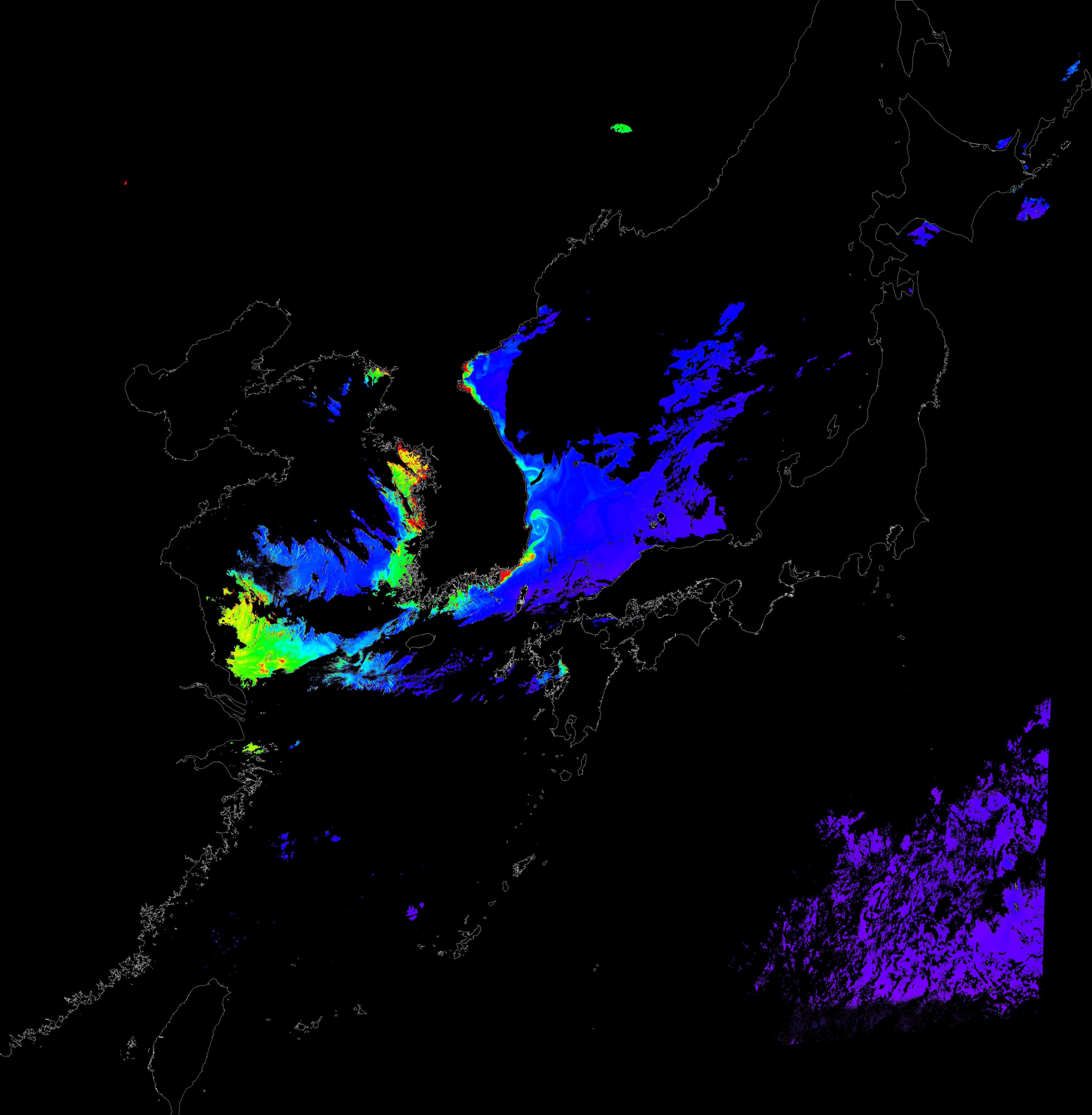 o 2016년 7월 9일 천리안 GOCI 클로로필 a 위성영상입니다.