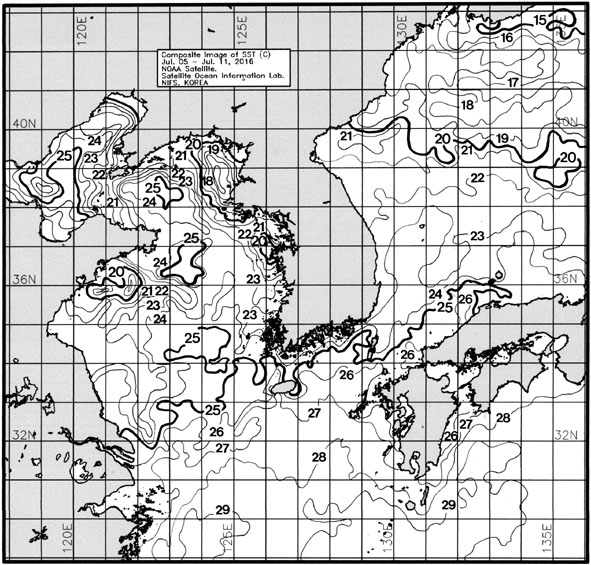 ◦ 금주(2016. 07. 05 ~ 07. 11)의 한국근해 표면수온은 대화퇴 근해 20~21도, 울릉도-독도 근해 23~24도, 대마도 근해 24~26도, 제주도 근해 25~27도, 이어도 근해 26~27도, 가거초 근해 24~25도, 어청도 근해 22~23도, 백령도 근해 18∼20도로 나타납니다. ◦ 「평년에 비해」대화퇴 근해 1.1도 낮게, 울릉도-독도 근해 1.1도 높게, 대마도 근해 0.5도 높게, 제주도 1.2도 높게, 이어도 비슷하게, 가거초 근해 비슷하게, 어청도 근해 0.4도 낮게 나타납니다. ◦ 「전년에 비해」대화퇴 근해 1도 낮게, 울릉도-독도 근해 2도 높게, 대마도 근해 3.5도 높게, 제주도 근해 3도 높게, 이어도 근해 2도 높게, 가거초 근해 1도 높게, 어청도 근해 2도 낮게, 백령도 근해 3.5도 낮게 나타납니다. ◦ 수온 전선대는 우리나라 제주해협에서 대한해협까지 25도를 중심으로 형성됩니다. |