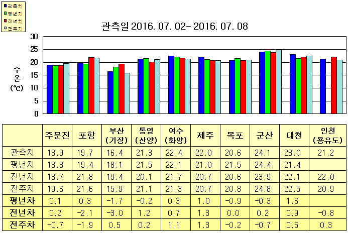 ◦ 금주(2016. 07. 02 ~ 07. 08)의 한반도 연안 표면수온은 동해 연안역에서 섭씨 16~20도, 남해 연안역 21.0~22.5도, 서해 연안역에서 20.5~24.5도로 나타납니다. ◦ 평년에 비해 부산(기장) 1.7도 낮음을 제외한 동해 연안역은 비슷하게, 제주 1도 높음을 제외한 남해 연안역은 비슷하게, 서해 연안역은 목포 0.9도 낮게, 군산 비슷하게, 대천 1.6도 높게 나타납니다. ◦ 전년에 비해 주문진 비슷함을 제외한 동해 연안역은 2~3도 낮게, 남해 연안역은 0.5~1.5도 높게, 대천 0.9도 높음, 인천(용유도) 0.8도 낮음을 제외한 서해 연안역은 비슷하게 나타납니다. |