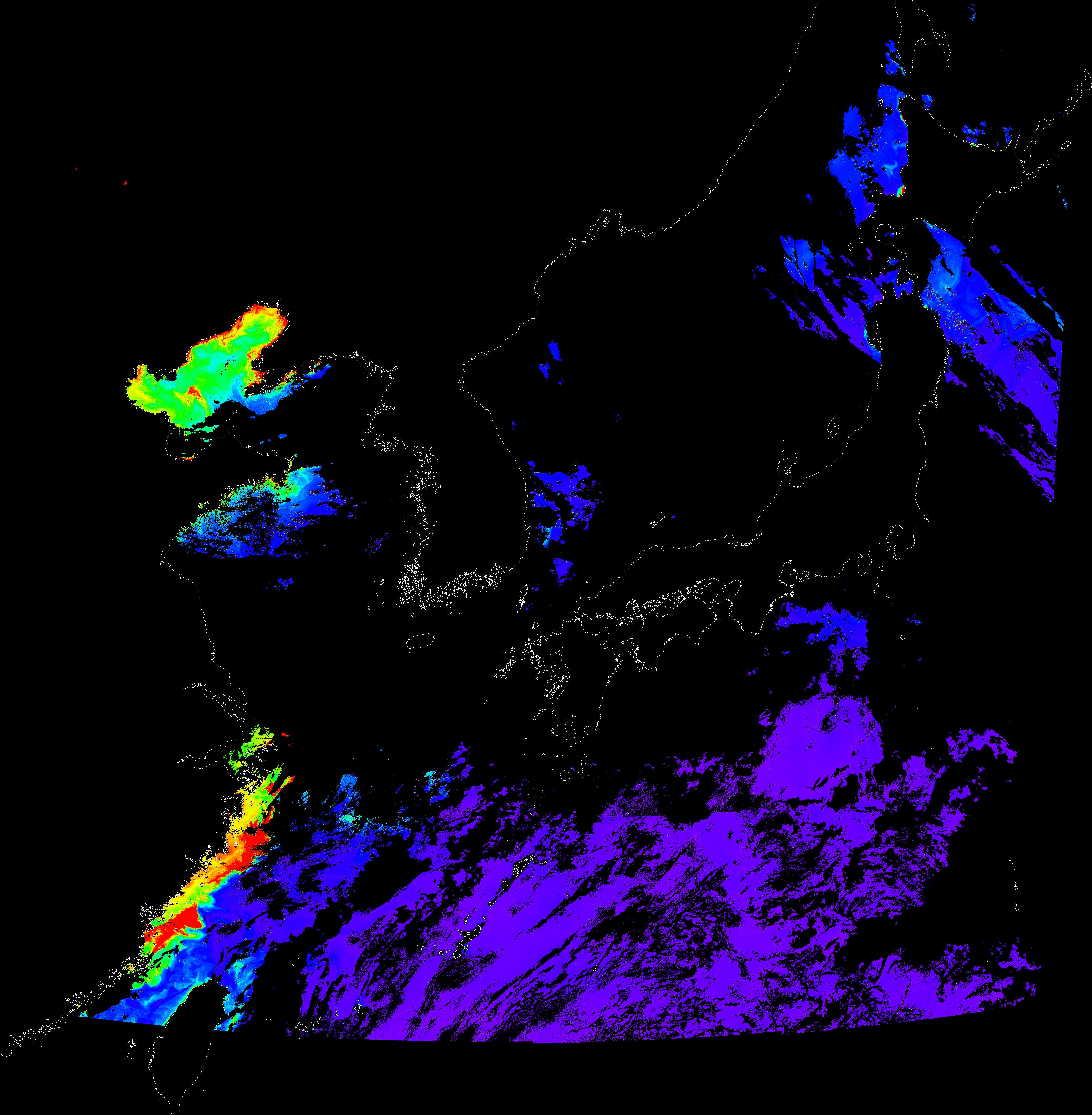 o 2016년 7월 13일 천리안 GOCI 클로로필 a 위성영상입니다.