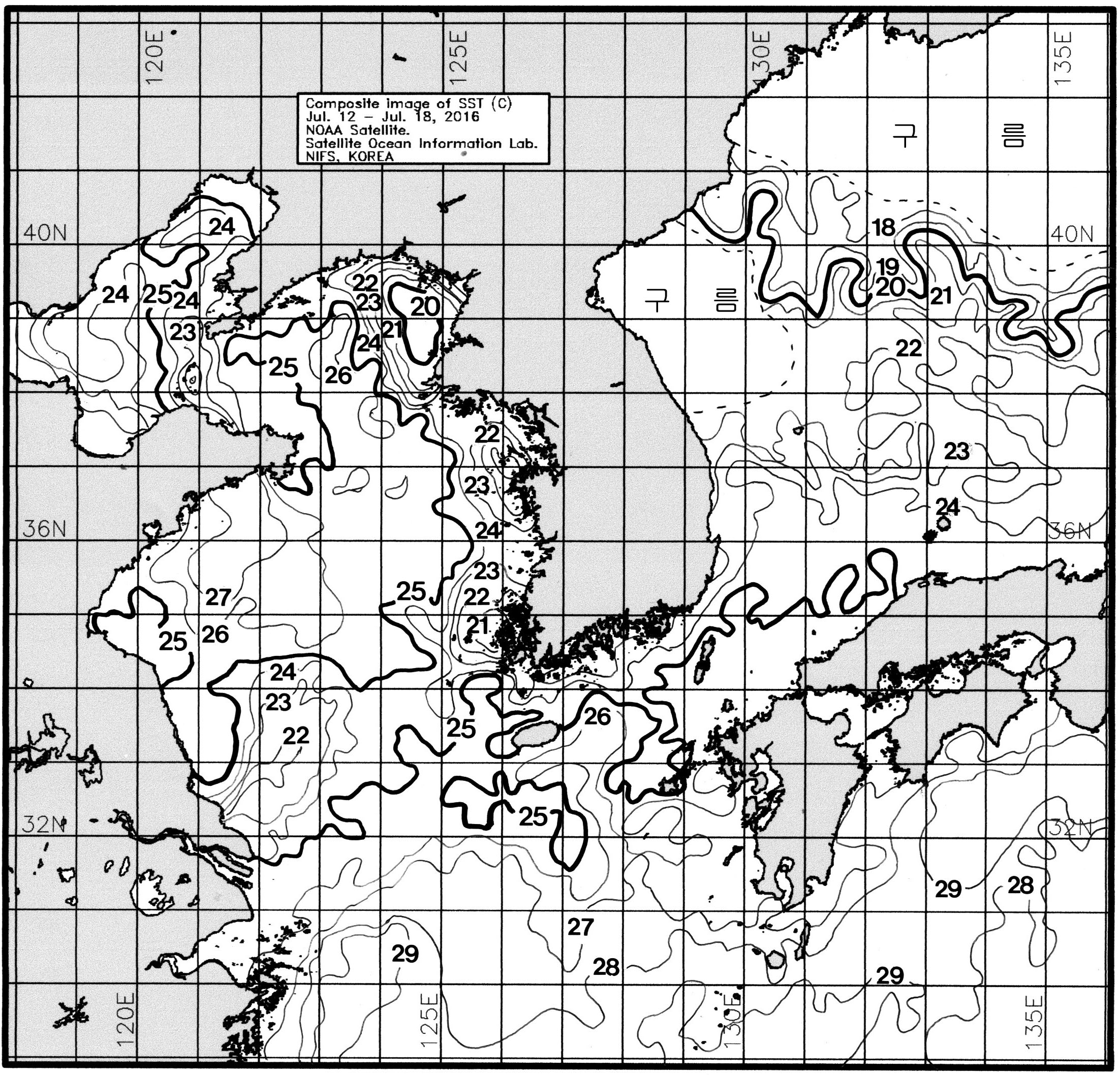 ◦ 금주(2016. 07. 12 ~ 07. 18)의 한국근해 표면수온은 대화퇴 근해 18~20도, 울릉도-독도 근해 22~23도, 대마도 근해 24~26도, 제주도 근해 24~26도, 이어도 근해 25~26도, 가거초 근해 23~24도, 어청도 근해 23~24도, 백령도 근해 21∼23도로 나타납니다. ◦ 「평년에 비해」대화퇴 근해 2.7도 낮게, 울릉도-독도 근해 비슷하게, 대마도 근해 0.4도 높게, 제주도 비슷하게, 이어도 0.8도 낮게, 가거초 근해 0.8도 낮게, 어청도 근해 0.7도 높게 나타납니다. ◦ 「전년에 비해」대화퇴 근해 3.5도 낮게, 울릉도-독도 근해 1도 높게, 대마도 근해 2도 높게, 제주도 근해 2도 높게, 이어도 근해 2도 높게, 가거초 근해 1도 높게, 어청도 근해 1도 높게, 백령도 근해 3도 높게 나타납니다. ◦ 수온 전선대는 우리나라 제주해협에서 대한해협까지 25도를 중심으로 형성됩니다. |