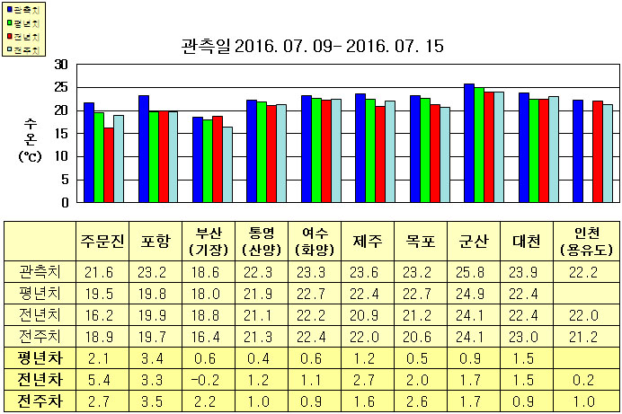 ◦ 금주(2016. 07. 09 ~ 07. 15)의 한반도 연안 표면수온은 동해 연안역에서 섭씨 18.5~23.5도, 남해 연안역 22~24도, 서해 연안역에서 22~26도로 나타납니다. ◦ 평년에 비해 동해 연안역은 0.5~3.5도 높게, 남해 연안역은 0.5~1.5도 높게, 서해 연안역은 0.5~1.5도 높게 나타납니다. ◦ 전년에 비해 부산(기장) 비슷함을 제외한 동해 연안역은 2~3도 높게, 남해 연안역은 1~3도 높게, 인천(용유도) 비슷함을 제외한 서해 연안역은 1.5~2.0도 높게 나타납니다. |