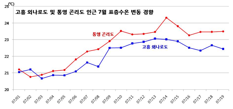 | 유해적조 발생 전 전남 고흥 및 경남 통영 7월 수온 정보(해양자료속보, 제4914호) | |||||