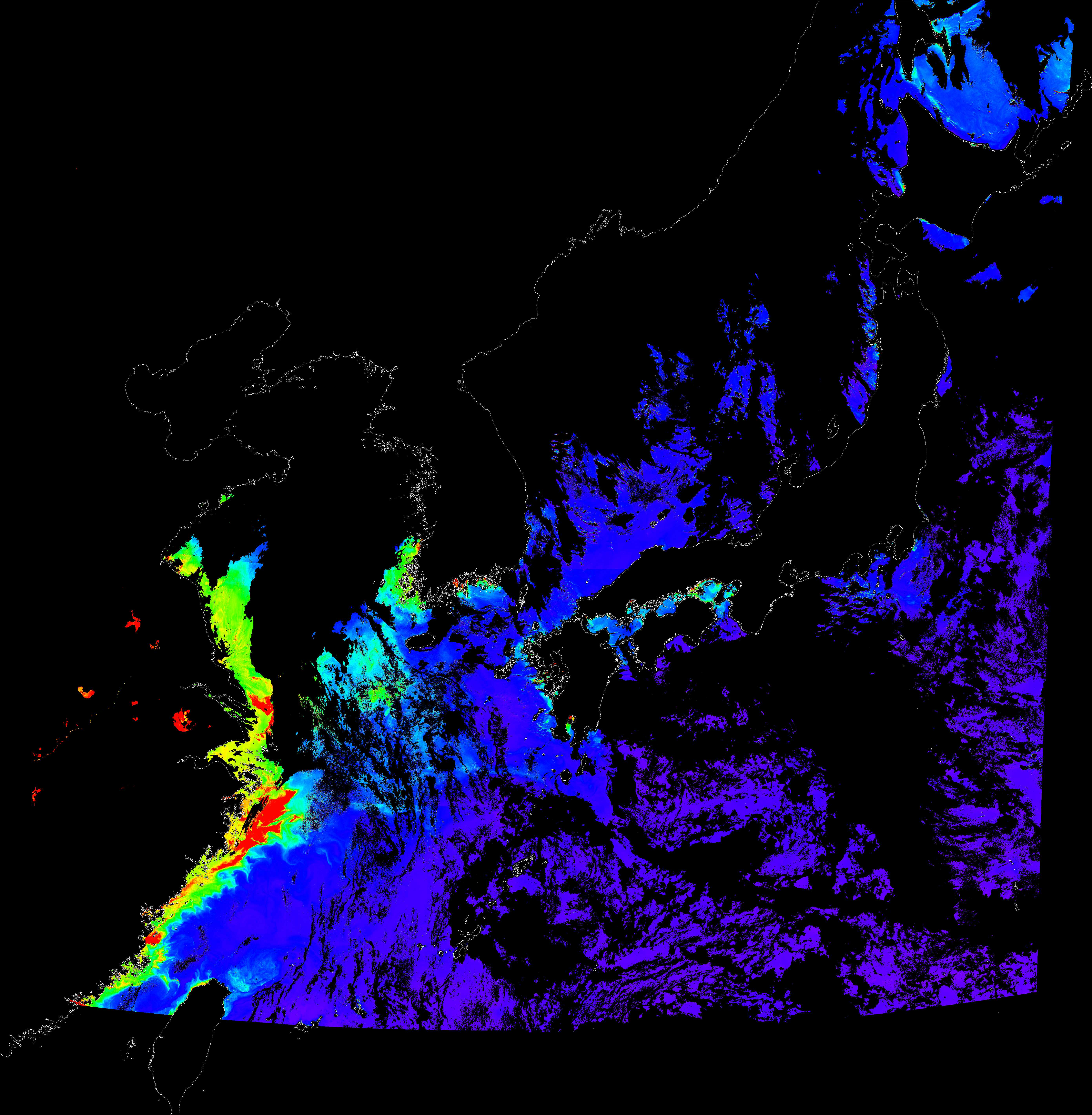 o 2016년 7월 23일 천리안 GOCI 클로로필 a 위성영상입니다.