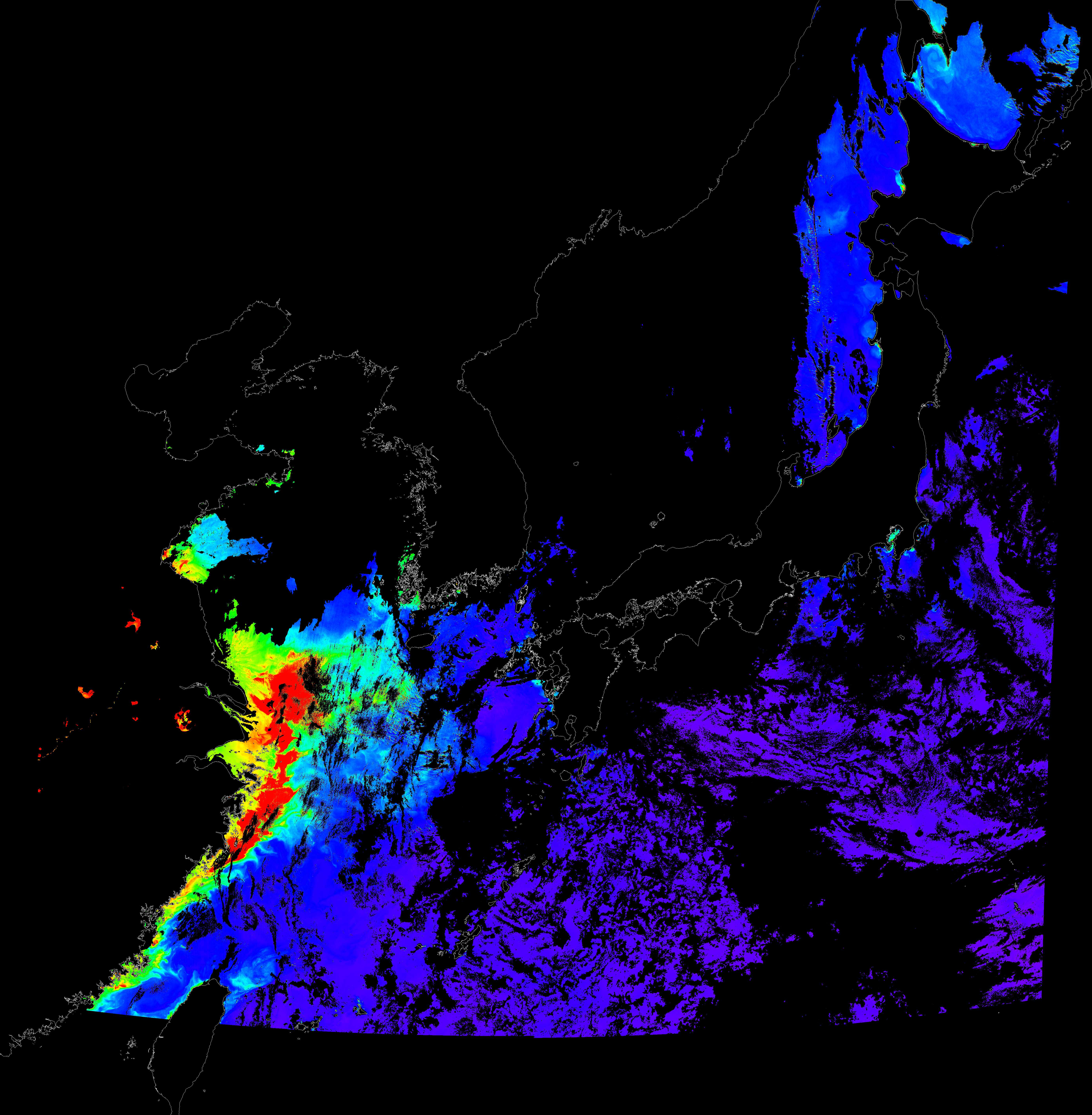 o 2016년 7월 24일 천리안 GOCI 클로로필 a 위성영상입니다.