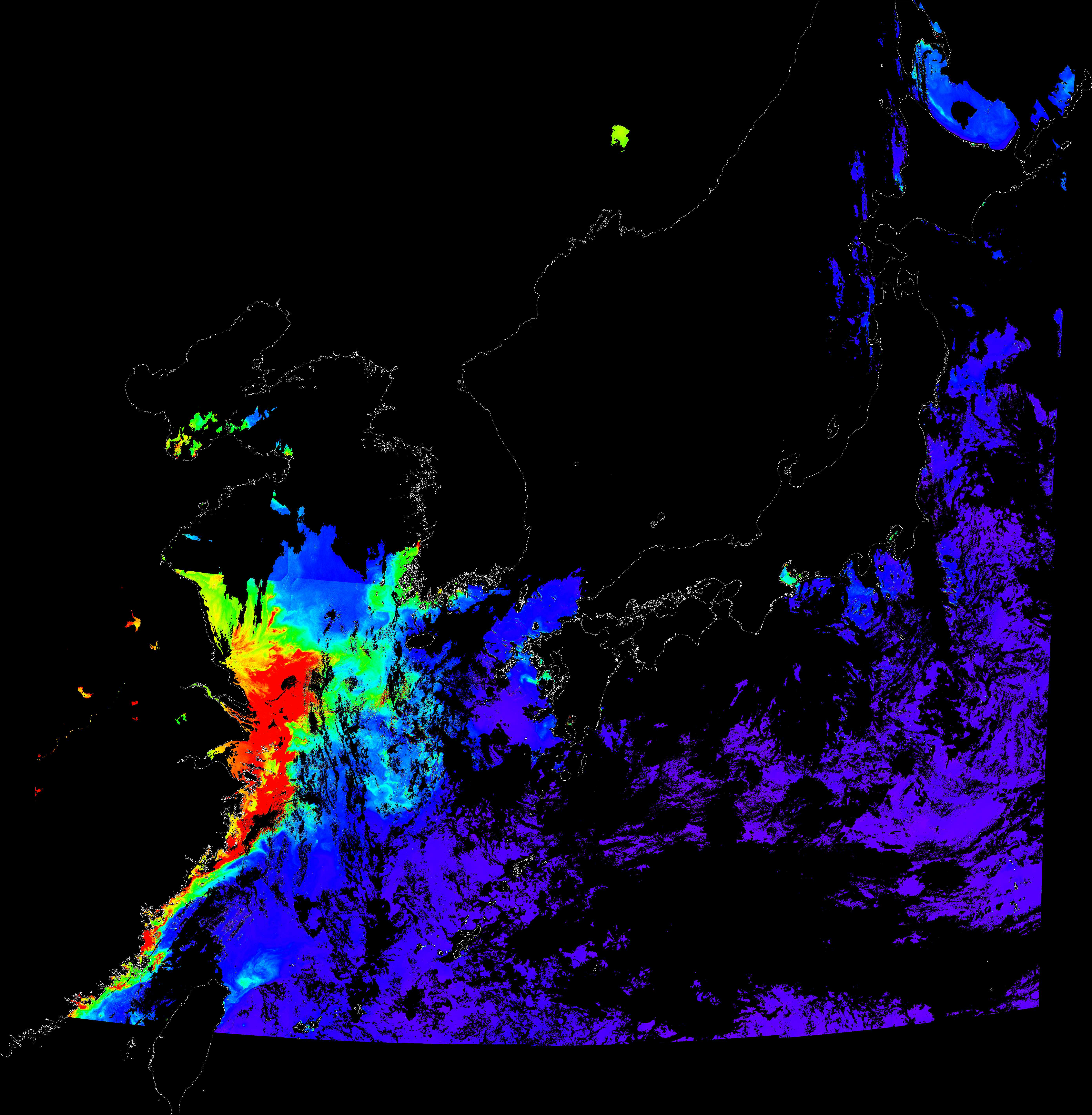 o 2016년 7월 25일 천리안 GOCI 클로로필 a 위성영상입니다.