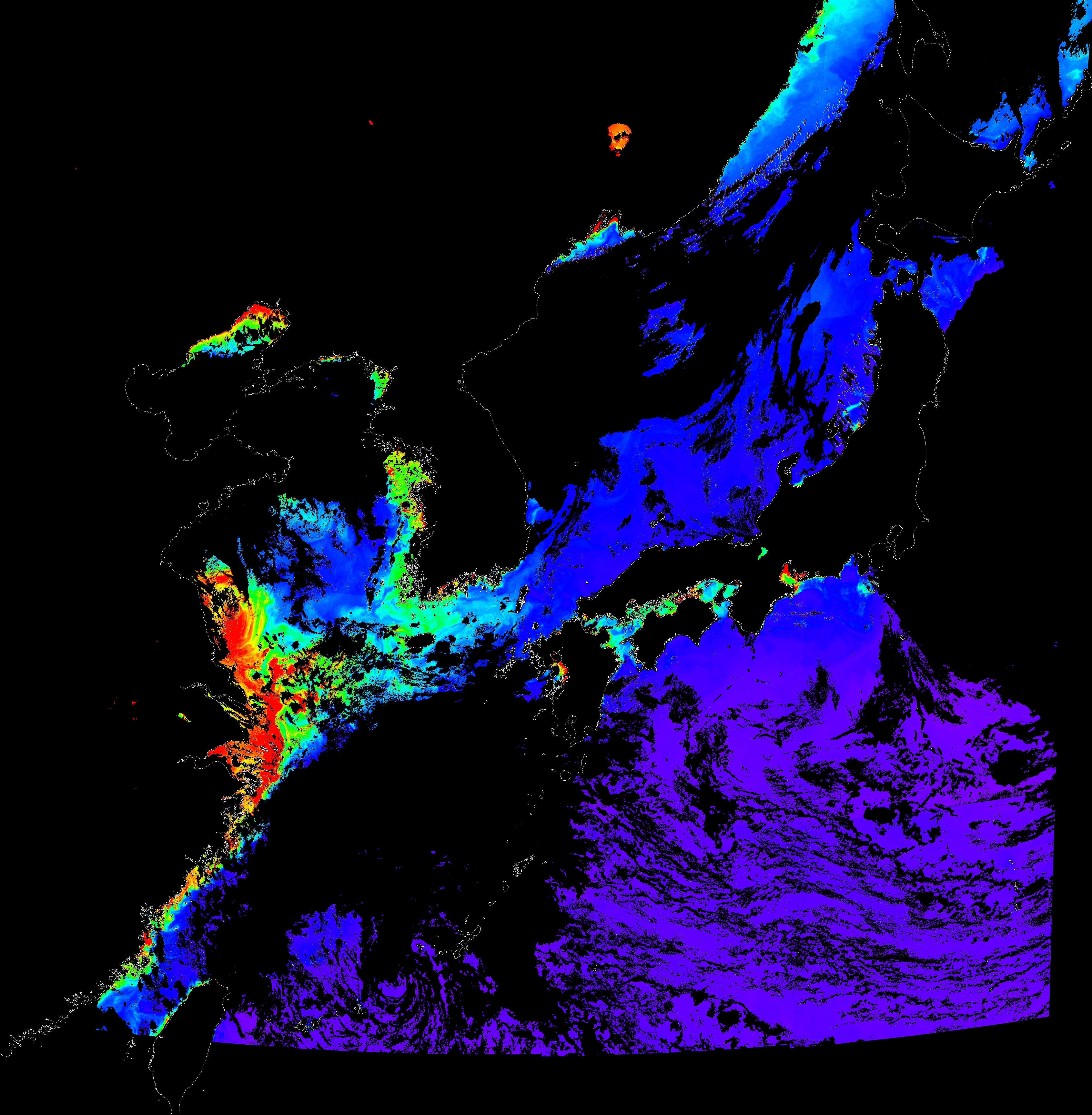 o 2016년 8월 8일 천리안 GOCI 클로로필 a 위성영상입니다.