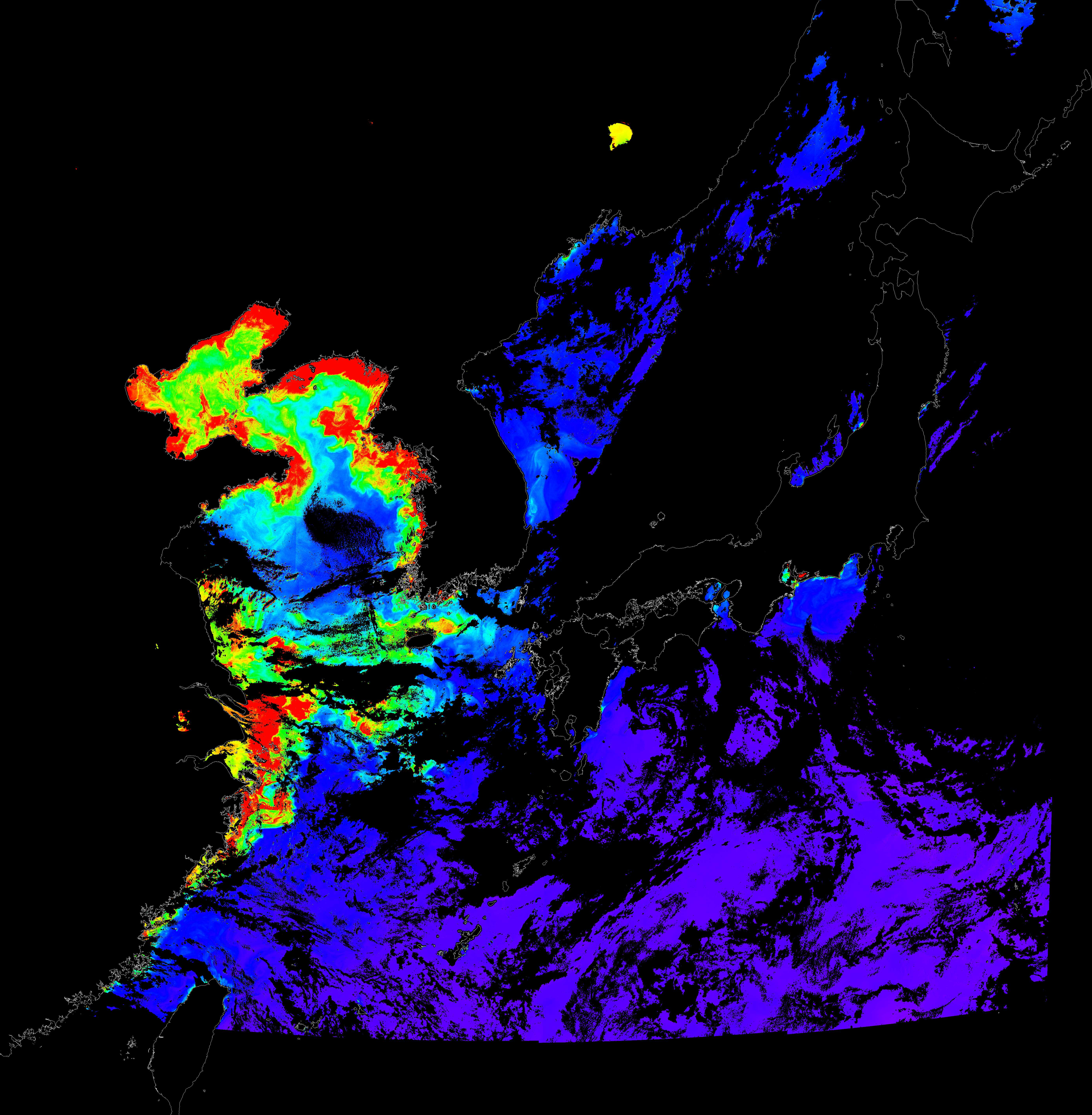 o 2016년 8월 16일 천리안 GOCI 클로로필 a 위성영상입니다.