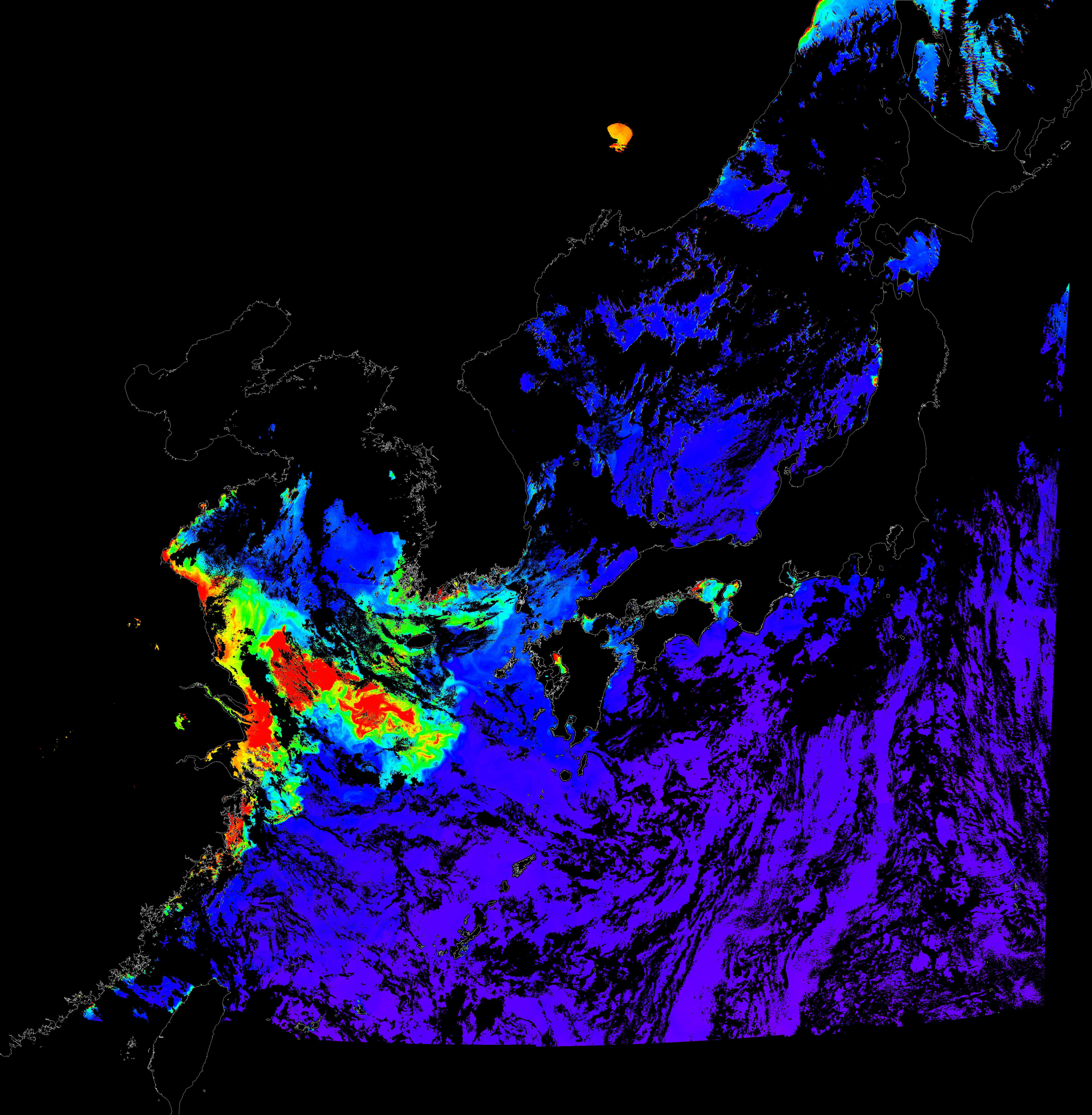 o 2016년 8월 18일 천리안 GOCI 클로로필 a 위성영상입니다.