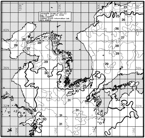 ◦ 금주(2016. 08. 16 ~ 08. 22)의 한국근해 표면수온은 대화퇴 근해 27~28도, 울릉도-독도 근해 29~30도, 대마도 근해 30~31도, 제주도 근해 29~31도, 이어도 근해 31~32도, 가거초 근해 30~31도, 어청도 근해 28~29도, 백령도 근해 23∼25도로 나타납니다.