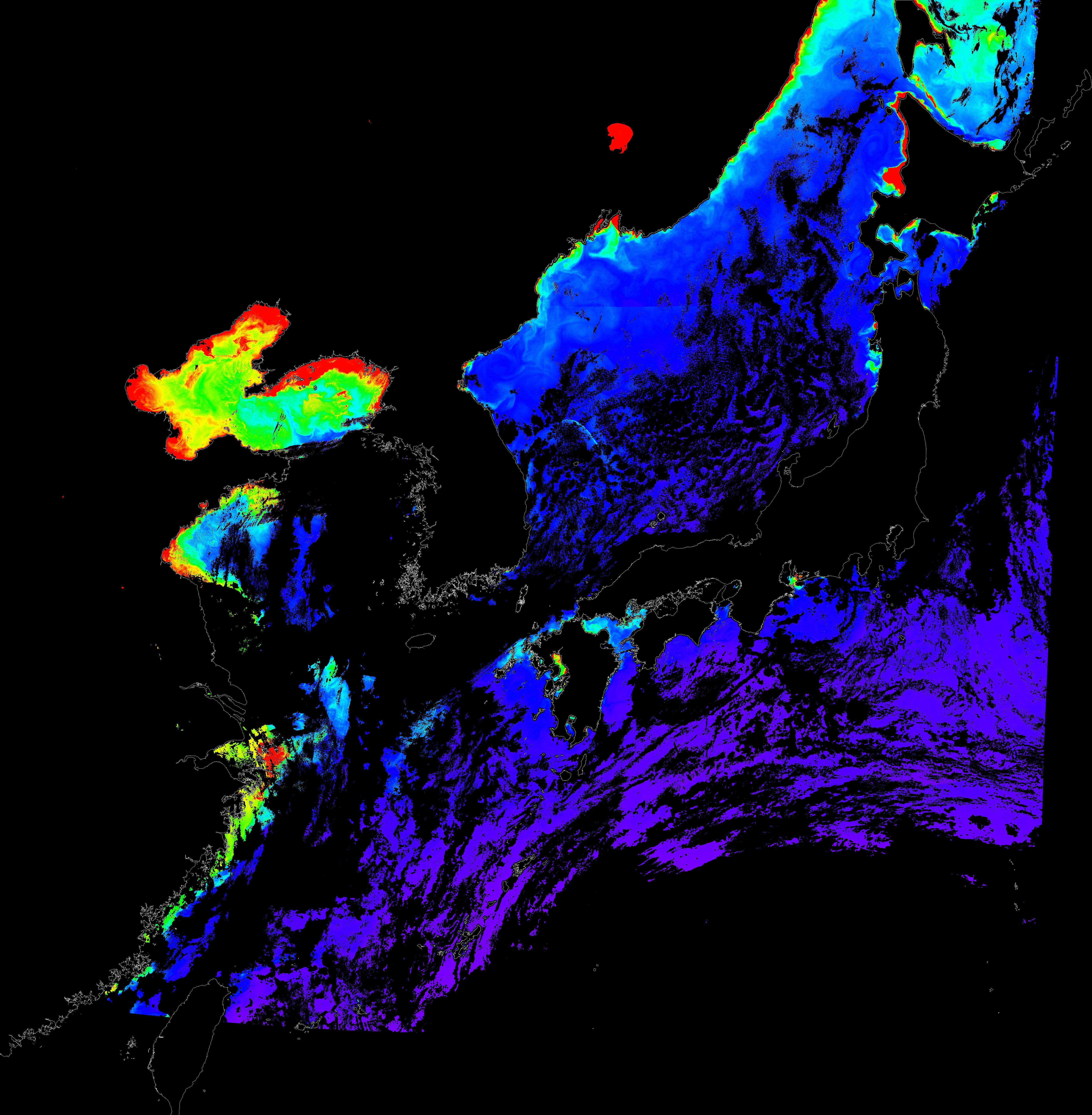 o 2016년 8월 27일 천리안 GOCI 클로로필 a 위성영상입니다.