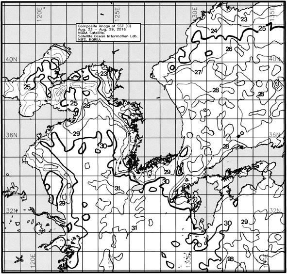 ◦ 금주(2016. 08. 23 ~ 08. 29)의 한국근해 표면수온은 대화퇴 근해 27~28도, 울릉도-독도 근해 28~29도, 대마도 근해 29~30도, 제주도 근해 29~31도, 이어도 근해 30~32도, 가거초 근해 29~31도, 어청도 근해 27~28도, 백령도 근해 22∼24도로 나타납니다. ◦ 「평년에 비해」대화퇴 근해 3.2도 높게, 울릉도-독도 근해 3.8도 높게, 대마도 근해 2.6도 높게, 제주도 3.2도 높게, 이어도 3.5도 높게, 가거초 근해 4도 높게, 어청도 근해 2.4도 높게 나타납니다. ◦ 「전년에 비해」대화퇴 근해 5도 높게, 울릉도-독도 근해 5도 높게, 대마도 근해 3도 높게, 제주도 근해 3.5도 높게, 이어도 근해 4.5도 높게, 가거초 근해 4.5도 높게, 어청도 근해 2도 높게, 백령도 근해 0.5도 낮게 나타납니다. ◦ 수온 전선대는 우리나라 제주해협에서 대한해협까지 29도를 중심으로 형성됩니다. |