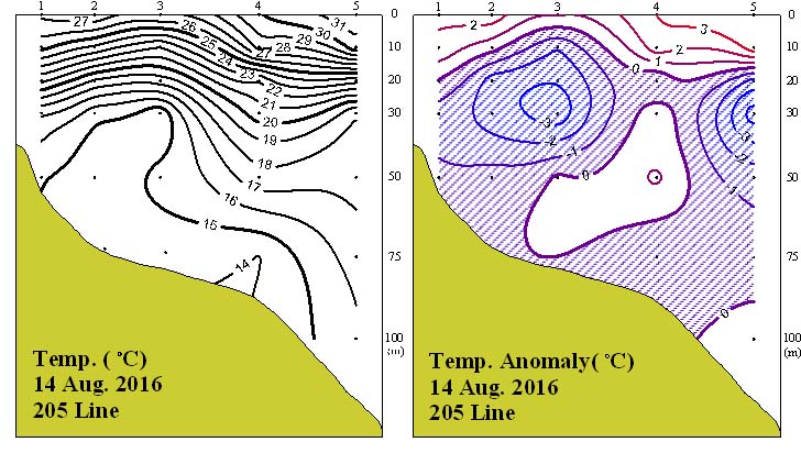 ◦ 2016년 8월 14일 국립수산과학원 남해수산연구소에서 조사한 205선 (소리도 남동방)의 수직수온분포도 및 평년편차도입니다. ◦ 조사해역 내 수심 10~50m에서 23℃를 중심으로 수온약층이 형성되었고, 13~31℃의 수온분포를 보였습니다. |