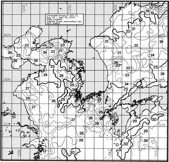 ◦ 금주(2016. 08. 30 ~ 09. 05)의 한국근해 표면수온은 대화퇴 근해 23~25도, 울릉도-독도 근해 24~25도, 대마도 근해 26~27도, 제주도 근해 25~27도, 이어도 근해 26~28도, 가거초 근해 24~26도, 어청도 근해 24~25도, 백령도 근해 22∼24도로 나타납니다. ◦ 「평년에 비해」대화퇴 근해 비슷하게, 울릉도-독도 근해 비슷하게, 대마도 근해 비슷하게, 제주도 비슷하게, 이어도 0.9도 높게, 가거초 근해 비슷하게, 어청도 근해 0.6도 높게 나타납니다. ◦ 「전년에 비해」대화퇴 근해 1.5도 높게, 울릉도-독도 근해 1도 높게, 대마도 근해 0.5도 높게, 제주도 근해 비슷하게, 이어도 근해 0.5도 높게, 가거초 근해 0.5도 낮게, 어청도 근해 비슷하게, 백령도 근해 1도 낮게 나타납니다. ◦ 수온 전선대는 우리나라 제주해협에서 대한해협까지 26도를 중심으로 형성됩니다. |