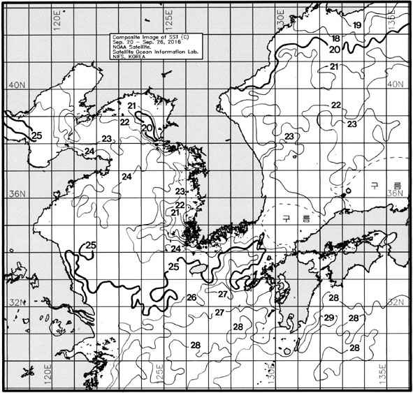 ◦ 금주(2016. 09. 20 ~ 09. 26)의 한국근해 표면수온은 대화퇴 근해 22~23도, 울릉도-독도 근해 23~24도, 대마도 근해 23~25도, 제주도 근해 24~26도, 이어도 근해 24~26도, 가거초 근해 23~25도, 어청도 근해 22~23도, 백령도 근해 20∼22도로 나타납니다. ◦ 「평년에 비해」대화퇴 근해 0.9도 높게, 울릉도-독도 근해 0.5도 높게, 대마도 근해 1.1도 낮게, 제주도 비슷하게, 이어도 비슷하게, 가거초 근해 0.7도 높게, 어청도 근해 0.9도 높게 나타납니다. ◦ 「전년에 비해」대화퇴 근해 1도 높게, 울릉도-독도 근해 0.5도 높게, 대마도 근해 0.5도 낮게, 제주도 근해 비슷하게, 이어도 근해 0.5도 낮게, 가거초 근해 0.5도 낮게, 어청도 근해 비슷하게, 백령도 근해 비슷하게 나타납니다. ◦ 수온 전선대는 우리나라 제주해협에서 대한해협까지 24도를 중심으로 형성됩니다. |