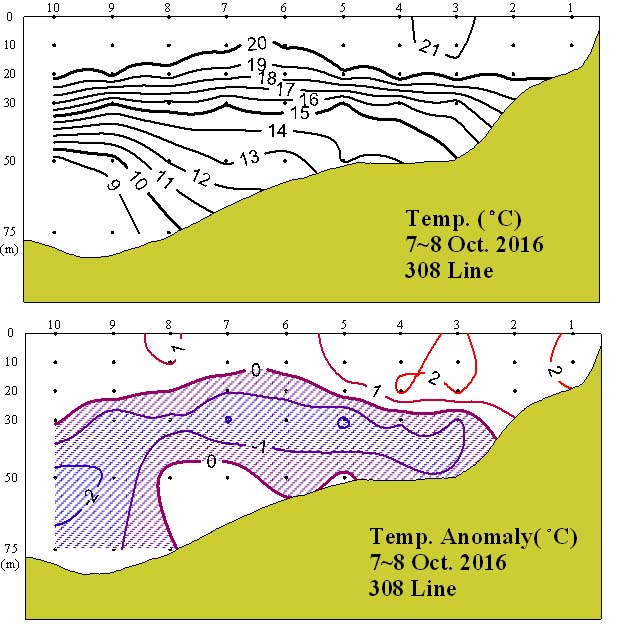 ◦ 2016년 10월 7~8일 국립수산과학원 서해수산연구소에서 조사한 308선(대천 서방)의 수직수온분포도 및 평년편차도입니다. ◦ 조사해역은 8∼21℃의 수온분포를 보였으며, 수심 10~50m에서 15℃를 중심으로 수온약층이 약하게 형성되었습니다.