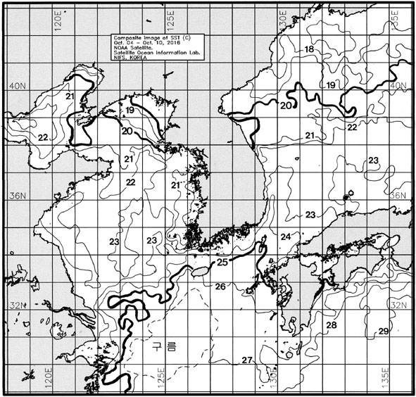 ◦ 금주(2016. 10. 04 ~ 10. 10)의 한국근해 표면수온은 대화퇴 근해 21~22도, 울릉도-독도 근해 22~23도, 대마도 근해 24~26도, 제주도 근해 24~26도, 이어도 근해 25~26도, 가거초 근해 23~24도, 어청도 근해 21~22도, 백령도 근해 19∼20도로 나타납니다. ◦ 「평년에 비해」대화퇴 근해 1.1도 높게, 울릉도-독도 근해 0.7도 높게, 대마도 근해 0.6도 높게, 제주도 0.9도 높게, 이어도 1.5도 높게, 가거초 근해 1.7도 높게, 어청도 근해 1.1도 높게 나타납니다. ◦ 「전년에 비해」대화퇴 근해 2도 높게, 울릉도-독도 근해 비슷하게, 대마도 근해 1.5도 높게, 제주도 근해 2도 높게, 이어도 근해 2도 높게, 가거초 근해 2도 높게, 어청도 근해 1.5도 높게, 백령도 근해 0.5도 높게 나타납니다. ◦ 수온 전선대는 우리나라 제주해협에서 대한해협까지 24도를 중심으로 형성됩니다. |