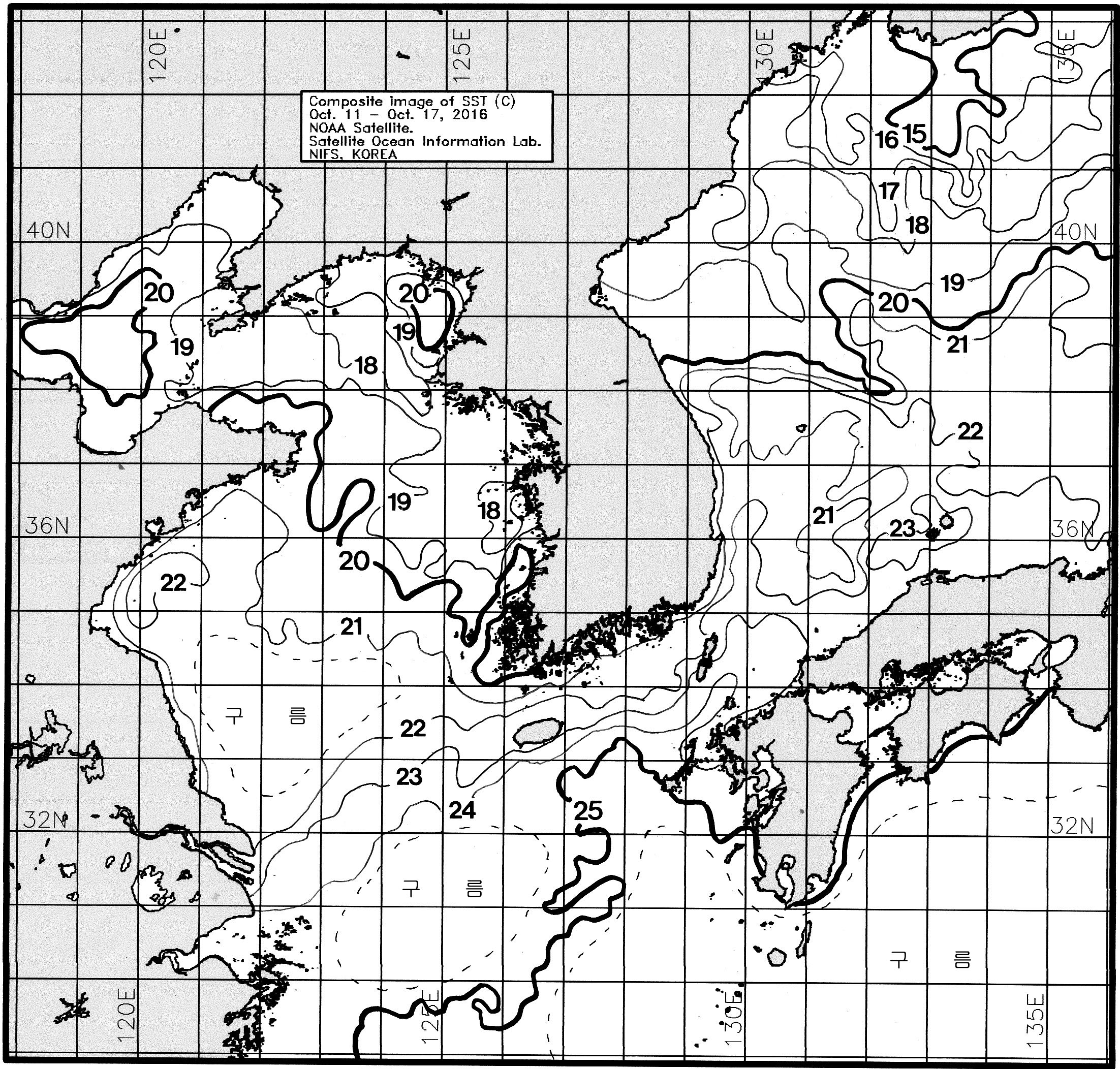 ◦ 금주(2016. 10. 11 ~ 10. 17)의 한국근해 표면수온은 대화퇴 근해 20~21도, 울릉도-독도 근해 21~23도, 대마도 근해 22~24도, 제주도 근해 22~23도, 이어도 근해 23~25도, 가거초 근해 20~22도, 어청도 근해 17~19도, 백령도 근해 17∼19도로 나타납니다. ◦ 「평년에 비해」대화퇴 근해 1.2도 높게, 울릉도-독도 근해 1.1도 높게, 대마도 근해 0.5도 낮게, 제주도 0.4도 낮게, 이어도 0.9도 높게, 가거초 근해 0.6도 높게, 어청도 근해 1도 낮게 나타납니다. ◦ 「전년에 비해」대화퇴 근해 2도 높게, 울릉도-독도 근해 0.5도 높게, 대마도 근해 1도 높게, 제주도 근해 비슷하게, 이어도 근해 1.5도 높게, 가거초 근해 비슷하게, 어청도 근해 1.5도 낮게, 백령도 근해 0.5도 낮게 나타납니다. ◦ 수온 전선대는 우리나라 제주해협에서 대한해협까지 23도를 중심으로 형성됩니다. |