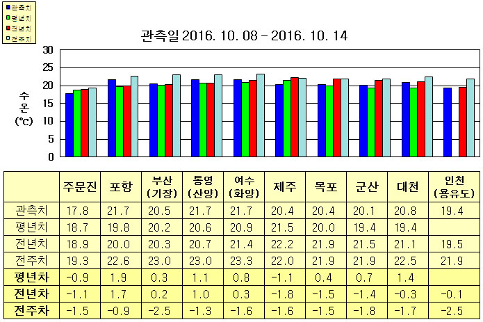 ◦ 금주(2016. 10. 08 ~ 10. 14)의 한반도 연안 표면수온은 동해 연안역에서 섭씨 17.5~22.0도, 남해 연안역 20~22도, 서해 연안역에서 19~21도로 나타납니다. ◦ 평년에 비해 제외한 동해 연안역은 주문진 0.9도 낮게, 포항 1.9도 높게, 부산(기장) 비슷하게, 제주 1.1도 낮음을 제외한 남해 연안역은 0.5~1.5도 높게, 서해 연안역은 0.5~1.5도 높게 나타납니다. ◦ 전년에 비해 동해 연안역은 주문진 1.1도 낮게, 포항 1.7도 높게, 부산(기장) 비슷하게, 남해 연안역은 통영(산양) 1도 높게, 여수(화양) 비슷하게, 제주 1.8도 낮게, 대천, 인천(용유도) 비슷함을 제외한 서해 연안역은 1.0~1.5도 낮게 나타납니다. |
