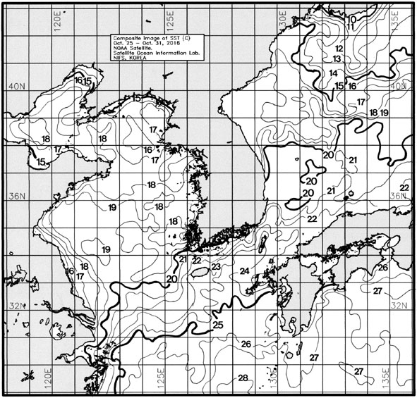 ◦ 금주(2016. 10. 25 ~ 10. 31)의 한국근해 표면수온은 대화퇴 근해 19~20도, 울릉도-독도 근해 20~21도, 대마도 근해 23~25도, 제주도 근해 22~24도, 이어도 근해 22~23도, 가거초 근해 18~19도, 어청도 근해 18~19도, 백령도 근해 16∼17도로 나타납니다. ◦ 「평년에 비해」대화퇴 근해 1.7도 높게, 울릉도-독도 근해 1도 높게, 대마도 근해 1.4도 높게, 제주도 1.3도 높게, 이어도 0.5도 높게, 가거초 근해 0.6도 낮게, 어청도 근해 0.9도 높게 나타납니다. ◦ 「전년에 비해」대화퇴 근해 2도 높게, 울릉도-독도 근해 0.5도 낮게, 대마도 근해 1도 높게, 제주도 근해 0.5도 높게, 이어도 근해 비슷하게, 가거초 근해 1.5도 낮게, 어청도 근해 비슷하게, 백령도 근해 2도 낮게 나타납니다. ◦ 수온 전선대는 우리나라 제주해협에서 대한해협까지 22도를 중심으로 형성됩니다. |
