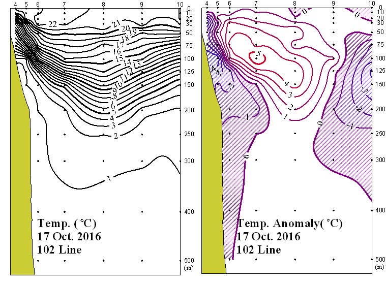 ◦ 2016년 10월 17일 국립수산과학원 동해수산연구소에서 조사한 102선(포항 동방)의 수직수온분포도 및 평년편차도입니다.