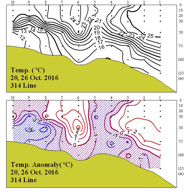 ◦ 2016년 10월 20, 26일 국립수산과학원 남해수산연구소에서 조사한 314선 (제주 남부해역)의 수직수온분포도 및 평년편차도입니다. ◦ 조사해역 내 수심 20~100m에서 20℃를 중심으로 수온약층이 형성되었고, 11~25℃의 수온분포를 보였습니다. |
