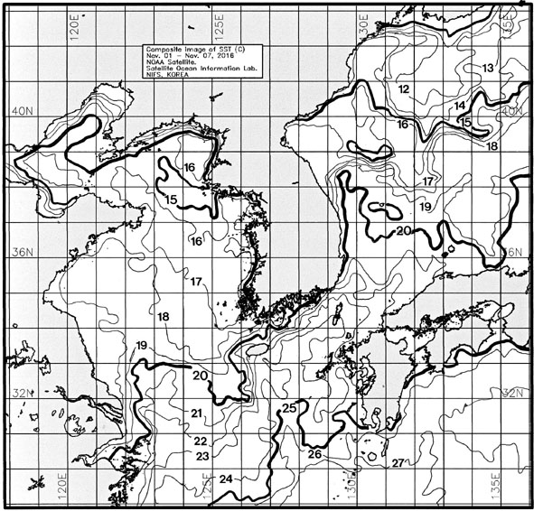 ◦ 금주(2016. 11. 01 ~ 11. 07)의 한국근해 표면수온은 대화퇴 근해 18~19도, 울릉도-독도 근해 19~20도, 대마도 근해 23~24도, 제주도 근해 21~23도, 이어도 근해 19~21도, 가거초 근해 17~18도, 어청도 근해 16~17도, 백령도 근해 14∼16도로 나타납니다. ◦ 「평년에 비해」대화퇴 근해 2.1도 높게, 울릉도-독도 근해 1도 높게, 대마도 근해 1.7도 높게, 제주도 0.7도 높게, 이어도 0.7도 낮게, 가거초 근해 비슷하게, 어청도 근해 0.4도 높게 나타납니다. ◦ 「전년에 비해」대화퇴 근해 1도 높게, 울릉도-독도 근해 0.5도 높게, 대마도 근해 1.5도 높게, 제주도 근해 0.5도 높게, 이어도 근해 2.5도 낮게, 가거초 근해 1도 낮게, 어청도 근해 1도 낮게, 백령도 근해 0.5도 낮게 나타납니다. ◦ 수온 전선대는 우리나라 제주해협에서 대한해협까지 21도를 중심으로 형성됩니다. |