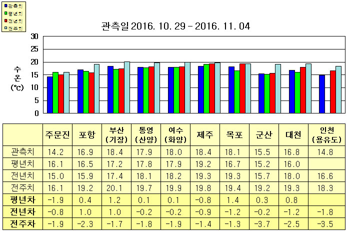 ◦ 금주(2016. 10. 29 ~ 11. 04)의 한반도 연안 표면수온은 동해 연안역에서 섭씨 14.0~18.5도, 남해 연안역 17.5~18.5도, 서해 연안역에서 14.5~18.5도로 나타납니다. ◦ 평년에 비해 주문진 1.9도 낮음을 제외한 동해 연안역은 0.5~1.5도 높게, 제주 0.8도 낮음을 제외한 남해 연안역은 비슷하게, 군산 비슷함을 제외한 서해 연안역은 0.5~1.5도 높게 나타납니다. ◦ 전년에 비해 주문진 0.8도 낮음을 제외한 동해 연안역은 0.5~1.0도 높게, 제주 0.9도 낮음을 제외한 남해 연안역은 비슷하게, 군산 비슷함을 제외한 서해 연안역은 1~2도 낮게 나타납니다. |
