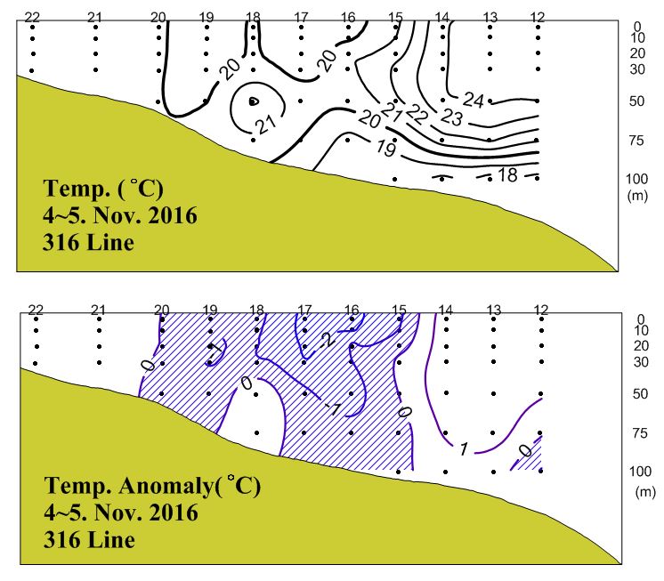 (316)의 수온 수직분포도와 평년편차도입니다.