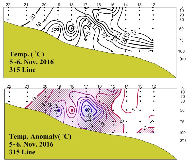 ◦ 2016년 11월 5~6일 국립수산과학원 기후변화연구과에서 조사한 동중국해 북부해역(315선)의 수온 수직분포도와 평년편차도입니다.