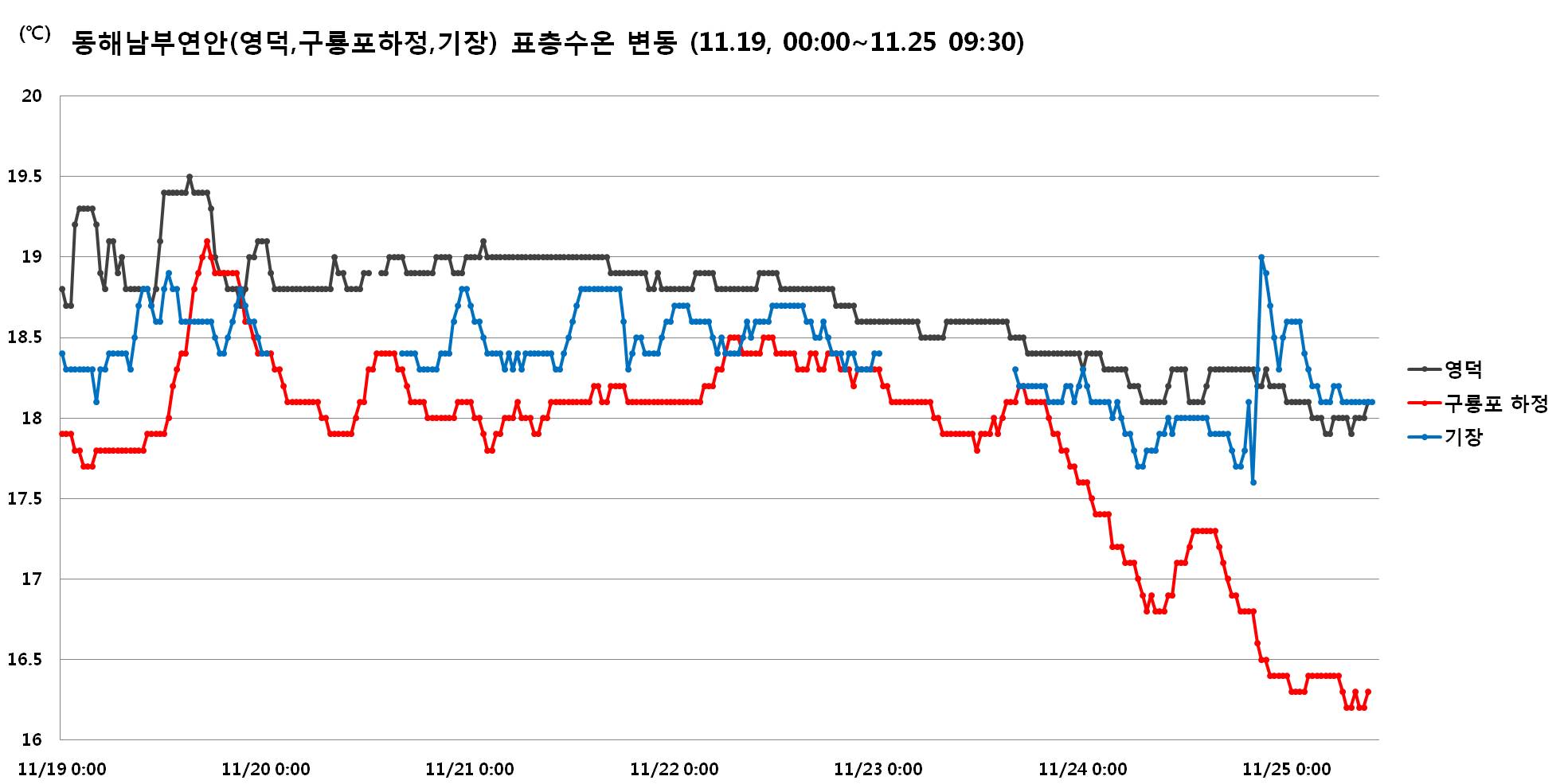 ◦ 국립수산과학원에서 설치 운영하고 있는 실시간 해양환경 어장정보시스템 자료의 분석 결과, 동해 남부해역 (영덕, 구룡포 하정, 기장)에서의 최근 수온 변동 경향은 아래와 같습니다(11월19일∼11월25일). ◦ 현재(11월25일) 영덕 18.1℃, 구룡포 하정 16.3℃, 기장 18.1℃ 수온을 보이고 있으며, 같은 기간의 동해중부해역 보다는 3∼4℃ 높게 나타고 있습니다. ◦ 기상청의 장기예보에서 찬 대륙고기압이 확장하면서 기온이 큰 폭으로 떨어질수도 있다하니 수온 급하강 또는 급상승에 주의하여 주시기 바랍니다. |