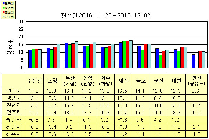 ◦ 금주(2016. 11. 26 ~ 12. 02)의 한반도 연안 표면수온은 동해 연안역에서 섭씨 11.0~16.5도, 남해 연안역 13.0~16.5도, 서해 연안역에서 8.5~14.5도로 나타납니다. ◦ 평년에 비해 주문진 0.8도 낮음을 제외한 동해 연안역은 0.5~1.5도 높게, 제주 0.6도 낮음을 제외한 남해 연안역은 비슷하게, 서해 연안역은 1.0~4.5도 높게 나타납니다. ◦ 전년에 비해 부산(기장) 비슷함을 제외한 동해 연안역은 0.5~1.0도 낮게, 남해 연안역은 0.5~1.5도 낮게, 군산 1.8더 높음을 제외한 서해 연안역은 1.0~2.5도 낮게 나타납니다. |