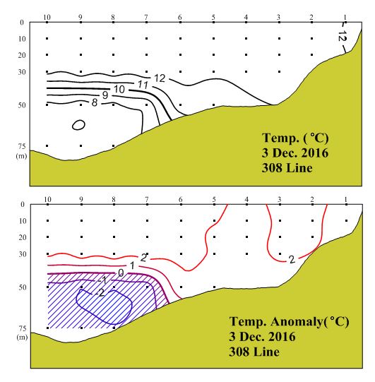 ◦ 2016년 12월 3일 국립수산과학원 서해수산연구소에서 조사한 308선(대천 서방)의 수직수온분포도 및 평년편차도입니다. ◦ 조사해역은 7∼12℃의 수온분포를 보였으며, 수심 30~50m에서 10℃를 중심으로 수온약층이 약하게 형성되었습니다. ◦ 평년에 비해 표층에서 수심 45m 이하에서 1~2℃ 범위의 저온현상을 보였고, 이를 제외한 나머지 대부분의 해역에서는 1~2℃ 범위의 고온현상을 보였습니다.