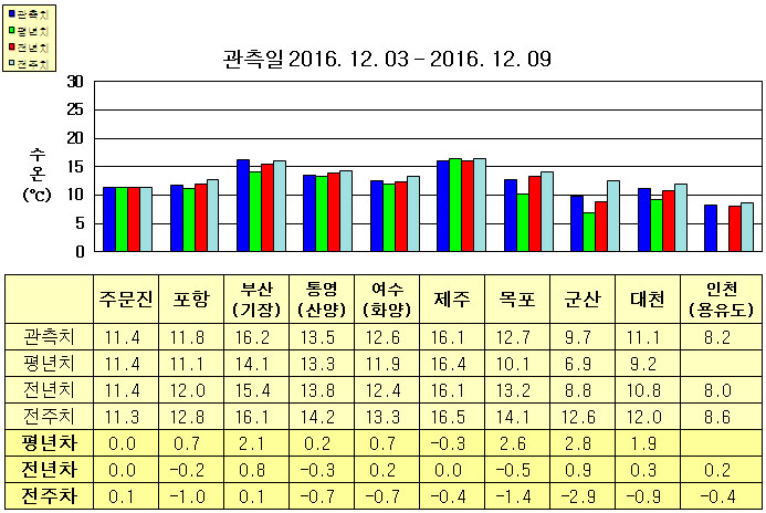 ◦ 금주(2016. 12. 03 ~ 12. 09)의 한반도 연안 표면수온은 동해 연안역에서 섭씨 11.0~16.5도, 남해 연안역 12.5~16.5도, 서해 연안역에서 8.0~12.5도로 나타납니다. ◦ 평년에 비해 주문진 비슷함을 제외한 동해 연안역은 0.5~2.5도 높게, 여수(화양) 0.7도 높음을 제외한 남해 연안역은 비슷하게, 서해 연안역은 1.5~3.0도 높게 나타납니다. ◦ 전년에 비해 부산(기장) 0.8도 높음을 제외한 동해 연안역은 비슷하게, 남해 연안역은 비슷하게, 목포 0.5도 낮음, 군산 0.9도 높음을 제외한 서해 연안역은 비슷하게 나타납니다. |