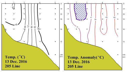 ◦ 2016년 12월 13일 국립수산과학원 남해수산연구소에서 조사한 205선(소리도 남동방)의 수직수온분포도 및 평년편차도입니다. ◦ 계절적인 영향에 의하여 연직적으로 잘 혼합된 수온 구조를 나타내었으며, 13~20℃의 수온분포를 보였습니다. ◦ 평년에 비해 정점 2~3사이 표층에서 30m 사이에서 1℃ 내외의 저온현상을 보였고, 이를 제외한 대부분의 조사해역에서 1~3℃ 범위의 고온현상을 보였습니다. =$row['content']?> =$row['content']?> =$row['content']?> |