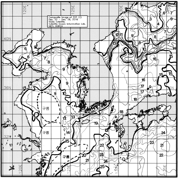 ◦ 금주(2016. 12. 20 ~ 12. 26)의 한국근해 표면수온은 대화퇴 근해 13~14도, 울릉도-독도 근해 15~16도, 대마도 근해 16~18도, 제주도 근해 16~18도, 이어도 근해 14~15도, 가거초 근해 11~12도, 어청도 근해 9~11도, 백령도 근해 8∼10도로 나타납니다. ◦ 「평년에 비해」대화퇴 근해 2.7도 높게, 울릉도-독도 근해 1.2도 높게, 대마도 근해 0.8도 낮게, 제주도 비슷하게, 이어도 비슷하게, 가거초 근해 1.3도 낮게, 어청도 근해 0.5도 높게 나타납니다. ◦ 「전년에 비해」대화퇴 근해 1도 높게, 울릉도-독도 근해 1도 높게, 대마도 근해 1.5도 낮게, 제주도 근해 0.5도 낮게, 이어도 근해 1.5도 낮게, 가거초 근해 2.5도 낮게, 어청도 근해 1.5도 낮게, 백령도 근해 2도 낮게 나타납니다. ◦ 수온 전선대는 우리나라 제주해협에서 대한해협까지 17도를 중심으로 형성됩니다. |