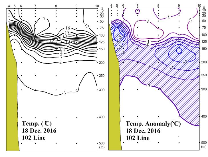 ◦ 2016년 12월 18일 국립수산과학원 동해수산연구소에서 조사한 102선(포항 동방)의 수직수온분포도 및 평년편차도입니다. ◦ 조사해역 내에서 12℃를 중심으로 수온약층이 약하게 형성되었으며, 1∼17℃의 수온분포를 보였습니다. ◦ 평년에 비해 정점 4~8사이 수심 100~300m에서 1~5℃ 범위의 저온현상을 보였고, 정점 8~10사이 수심 125~350m에서 1~3℃ 내외의 저온현상을 보였으며, 이를 제외한 나머지 해역에서는 1~2℃ 범위의 고온현상을 보였습니다. |