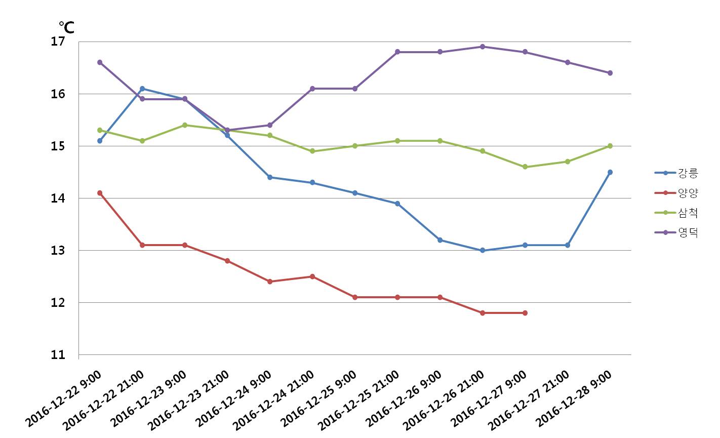 ◦ 국립수산과학원에서 설치 운영하고 있는 실시간 어장정보시스템 관측 자료의 분석결과 동해(강릉, 양양, 삼척, 영덕)연안의 최근 수온 변동 경향은 아래와 같습니다(12월22∼28일). ◦ 12월 28일 현재, 양양은 11∼12℃범위를 강릉, 삼척, 영덕의 경우 14∼16℃내외 범위의 수온을 보이고 있습니다.