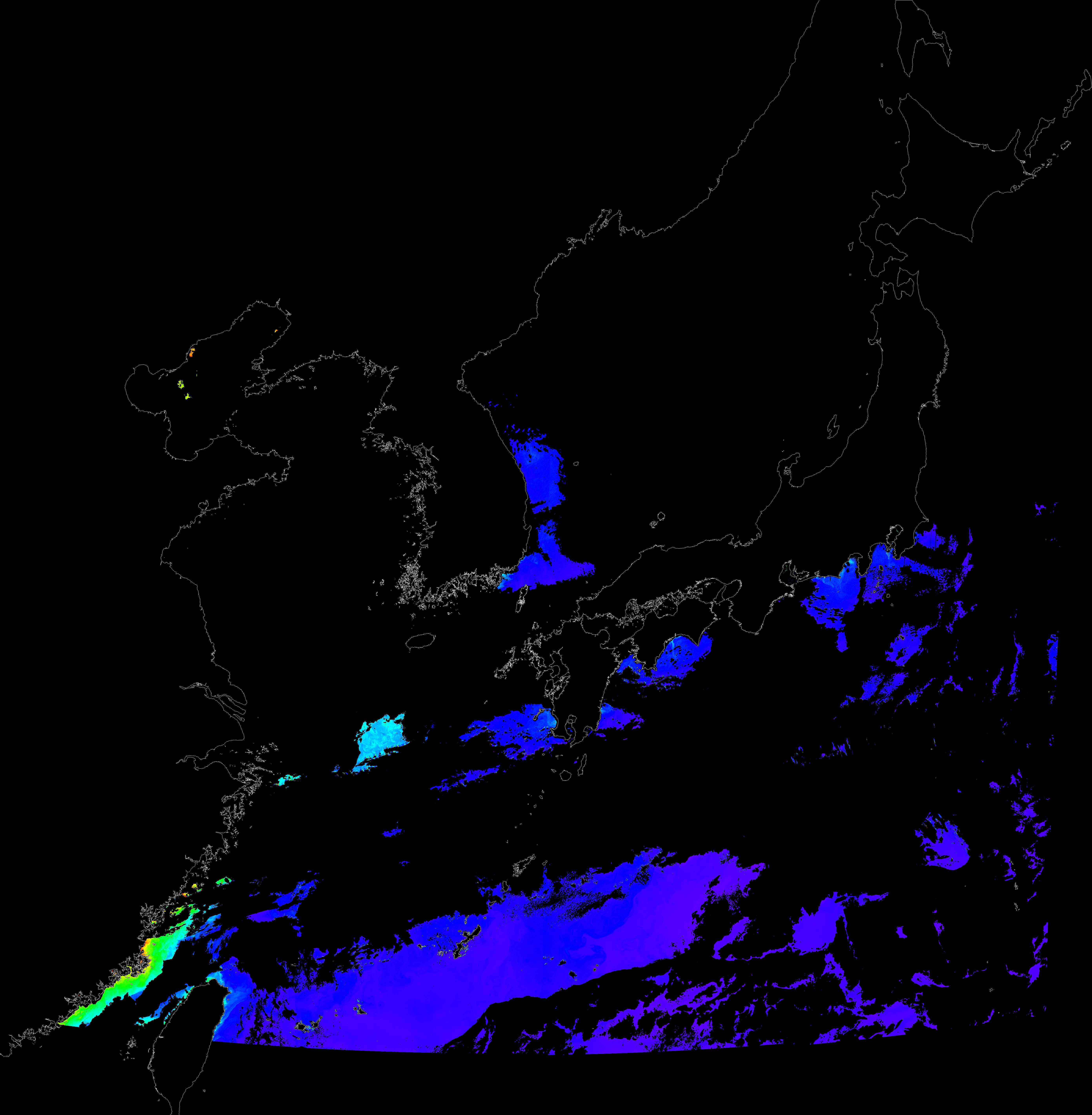 o 2017년 01월 02일 천리안 GOCI 클로로필 a 위성영상입니다.